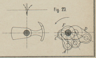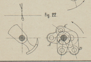 Stich machen zu lassen. Beim dritten Viertel der Umdrehung, wobei die Kurbel A nach unten steht (vgl. Fig. 23), bewegt sich der