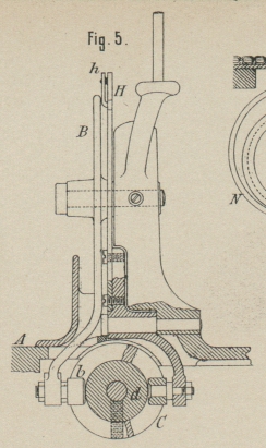 zweiarmigen Hebel H (Fig. 1 und 5) an und bewegt diesen