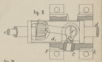welcher sich um den im Wellenstücke d1 festgeschraubten Bolzen f dreht. Der Zahnbogen f2 fragt zur Seite einen kurzen Arm mit der Rolle f1 (Fig. 9), die sich in einer