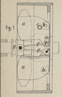 Gewichte a schwingen um die Bolzen b, werden durch an den Zapfen c angreifende, beide Gewichte mit einander elastisch verbindende