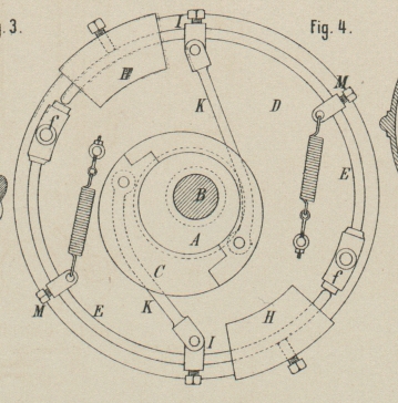 beweglich an der auf der Kurbelwelle festsitzenden Scheibe D angebracht sind. Hinter den Gewichten tragen die Stangen E stellbare Köpfe I, an welche die Stangen K angehängt sind und so mit dem Excenterringe C in Verbindung stehen. Ferner greifen an den Stangen