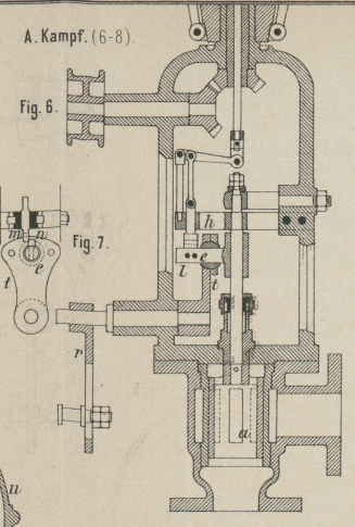 Dampfzutritt abgeschlossen ist, zurückkehrt. Die Kampf'sche Einrichtung benutzt zur Expansion einen Drehhahn a (Fig. 6 bis 8 Taf. 26). Ein auf dessen