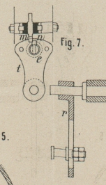 Grundschieberbewegung aus mittels Gestänges und der Hebel r und t sowie des Kugellagers e in Schwingungen versetzt. Der Backen n (vgl. Fig. 7) legt sich dabei