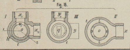 gelangt neuerdings zum Hahne, tritt hier durch den Stutzen x wieder in den Dreiwegehahn, strömt in der Rinne i um den Kegel o und durch die viereckigen