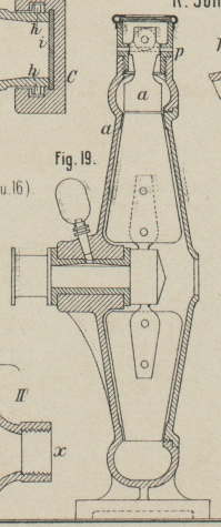 e, in welchem ein Rohr f befestigt ist, das mit einem vorstehendem Rande des Bodens von e einen Spalt bildet, durch welchen eine Verbindung des