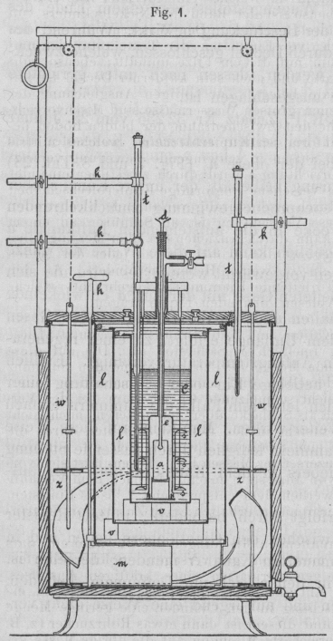Heben verhindert. An den Stäben des hölzernen Galgens sind gleitende Klammern k angebracht, welche die Thermometer t und die zum Ablesen dienenden Lupen tragen.