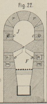 durch den Schlitz e mit der Kammer J. Zu jeder Seite des Feuerraumes liegt ein Luftkanal