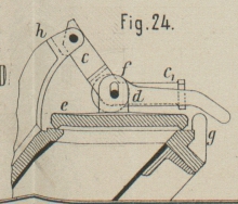 Deckels e, als auch einen zweiten Hebel d zwischen sich faſst. Der Hebel d ist um den Gelenkzapfen an dem Deckel e als Excenter ausgebildet und kann auf diesem Zapfen