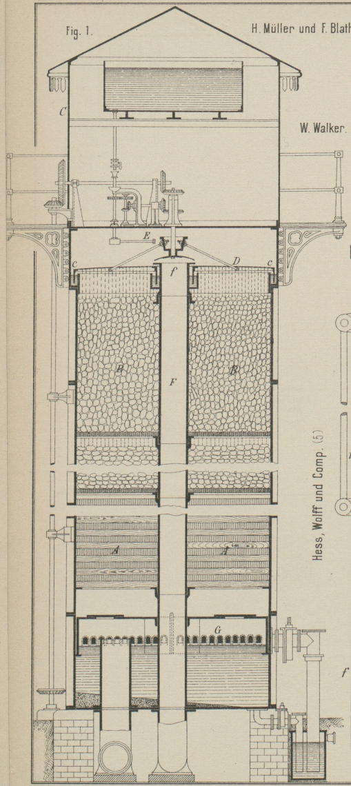 zugeführt, während die untere Kammer durch die von der oberen im Schlitze e herunterfallenden Kokes gespeist wird.
