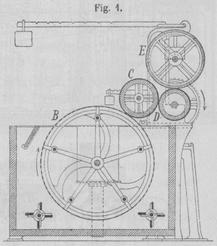 Filz ganz in Wegfall gekommen und soll statt seiner eine mit Filz überzogene Walze C, welche durch Gewichtshebel an die Siebtrommel B gepreſst wird, die Stoffschicht von B abnehmen und unmittelbar an die untere Preſswalze D übertragen, die ebenfalls mit feinem Filze überzogen