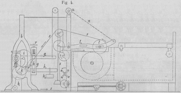 Handrade r versehene Schraube der Rahmen h verschieden hoch einzustellen ist, wie dies Fig. 3 zeigt. Dieser Rahmen h hängt über dem die Formatwalze i haltenden