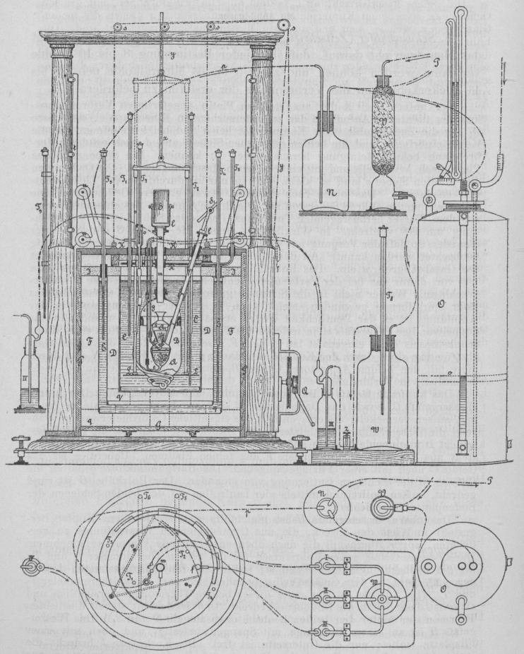 Ueber die Bestimmung des Brennwerthes. (Fortsetzung des Berichtes S. 413 d. Bd.) Mit Abbildungen. Ueber die Bestimmung des Brennwerthes. F. Schwackhöfer (Zeitschrift für analytische Chemie, 1884 *S. 453) legt das Hauptgewicht darauf, daſs bei jeder Bestimmung 8 bis 10g Kohle verbrannt werden können und zwar 5 bis 6g Mineralkohle nebst 2 bis 4g Zuckerkohle, um die Verbrennung der ersteren zu befördern. Der untere Theil A der aus starkem Platin angefertigten Verbrennungskammer dient zur Aufnahme der zu untersuchenden Mineralkohle, der obere A1 für die Zuckerkohle. Die Kammer ist bei a und bei b zu öffnen, um die Kohle einbringen und die beiden gebogenen Siebe c und d nach erfolgter Verbrennung behufs Reinigung herausnehmen zu können. Die Siebe sind aus Platinblech hergestellt und mit einer eigenen Maschine gelocht. Die Oeffnungen des unteren Siebes c sind so klein, daſs sie nur im durchfallenden Lichte deutlich erscheinen. Das obere Sieb d besitzt etwas gröſsere Oeffnungen. Die Rohre e, f und g führen Sauerstoff zu. Die Rohre f und m bestehen im oberen, aus dem Wasser herausragenden Theile aus Glas. (Das Rohr f ist in der Zeichnung um 900 verdreht. In Wirklichkeit stehen die Spiegel S und S1 hinter einander, so daſs der Vorgang auf den beiden Verbrennungsherden gleichzeitig beobachtet werden kann.) An der tiefsten Stelle des Mantelgefäſses mündet das Gasabsaugrohr n ein. Das Rohrende steht im Inneren des Gefäſses etwa 1cm vor, damit das bei der Verbrennung entstehende und im Gefäſse B niedergeschlagene Wasser nicht in die Schlange gelangt. Unter dem Gefäſse ist das Rohr spiralförmig gewunden, steigt dann in gerader Richtung auf (in der Abbildung ist es der Deutlichkeit wegen etwas gebogen) und mündet in das doppelwandige Glasgefäſs o, in welches das Thermometer T7 mittels eines Kautschukstöpsels dicht eingepaſst ist. (Vgl. F. Fischer 1879 234 * 397.) Die Gasabströmung steht durch den Kautschukschlauch p mit der Flasche N und durch diese mit den beiden Aspiratoren O und P (letzterer in der Zeichnung nicht ersichtlich) in Verbindung. Das kupferne Gefäſs B ist innen platinirt, auſsen vernickelt. Das innere Wassergefäſs C, sowie das Doppelgefäſs E sind aus Kupfer hergestellt, innen und auſsen vernickelt; ersteres enthält das eigentliche Calorimeterwasser, während die Wasserfüllung des letzteren den Zweck hat, die durch die Isolirungsschicht D kommende Wärme aufzunehmen. Die innere Isolirungsschicht D besteht aus Eiderdunen, die äuſsere F aus feinen Flaumen. Ueberdies ist das Gefäſs C noch mit einer Filzlage umgeben. Die Hartgummiklötze q halten die Gefäſse in der richtigen Entfernung von einander. Der Holzkübel G ist rund gedreht, auſsen polirt und mittels vier Laufrollen auf den beiden Schienen der Bodenplatte verschiebbar. Das obere Wassergefäſs H ist gleichfalls aus vernickeltem Kupfer hergestellt und hat den Zweck, die aus C aufsteigenden Wasserdünste zu verflüchten, sowie überhaupt die nach oben ausstrahlende Wärme aufzunehmen. Durch dieses Gefäſs gehen Rohrstutzen für die beiden Thermometer T1 und T2 , für die, Beobachtungsröhren f und m, sowie für die Führungsstangen des inneren Mischers. In dem Gefäſse selbst befinden sich zwei Winkelthermometer T5 und T6. (Im Aufrisse ist nur eines dieser beiden Thermometer ersichtlich und zwar ist dasselbe in die Bildebene gedreht. In Wirklichkeit stehen die beiden Thermometer hinter den beiden Beobachtungsspiegeln S und S1.) Das Wassergefäſs H ist an einem Holzringe mit Spangen befestigt und oben mit einer Filzplatte isolirt; nur die Unterseite ist frei. Die Korkplatte J bedeckt die Isolirschichten D und F und das Doppelgefäſs E. In der Deckplatte K aus Hartgummi sind die beiden Beobachtungsröhren f und m mittels Kork befestigt; ferner sind Oeffnungen vorhanden für die 6 Thermometer T1 bis T6 und für die Mischerstangen. Um die Platte in senkrechter Richtung heben zu können, sind an derselben zwei Seidenschnüre befestigt, welche über die Rollen s laufen und durch das Getriebe Q angezogen werden. Der Antrieb erfolgt durch eine archimedische Schraube, damit die Platte in jeder beliebigen Höhe stehen bleibt und ein freiwilliges Herabfallen derselben niemals vorkommen kann. Textabbildung Bd. 257, S. 518 Die beiden senkrechten Schienen t, welche den vier Laufrollen u als Führung dienen, verhindern jede seitliche Verschiebung der Platte. Die zwei Thermometer T1 und T2 sind mittels Kork in die Deckplatte K eingepaſst und werden nach Schluſs der Verbrennung jedesmal herausgenommen. Die beiden äuſseren Thermometer T3 und T4 sind in dem Schluſsringe des Doppelgefäſses E und die beiden oberen Thermometer T5 und T6 in dem Gefäſse H ein für allemal befestigt. Die Loupe zum Ablesen der Thermometer ist für die Orientirung des Auges mit zwei Visirfäden versehen. Die innere Mischvorrichtung L besteht aus einer ringförmigen, mit groſsen Oeffnungen versehenen Kupferplatte. Als Führungsstangen dienen die beiden Glasröhren v, welche oben und unten in Messingkapseln eingekittet sind. Die Führungsstange x ist aus Messingdraht hergestellt. Der Mischer wird mit Hilfe der Seidenschnur y, welche über zwei Rollen läuft, gehoben und sinkt durch sein Eigengewicht wieder zurück. Die Mischvorrichtung im äuſseren Doppelgefäſse besteht aus zwei wellenförmig gebogenen Kupferblechen, die an Glasröhren befestigt sind, welche letztere mit der Hand auf und ab bewegt werden. Auf solche Art wird das Wasser im cylinderförmigen Zwischenräume von E gemischt. Um auch das zwischen den beiden Böden befindliche Wasser in Bewegung zu setzen, ist noch ein durchbrochener Flügel vorhanden, welcher an einer Glasröhre sitzt und durch Drehung derselben einen Viertelkreisbogen beschreibt. Zu dem Calorimeter gehört noch ein Trockenthurm V mit Natronkalkfüllung, eine Flasche W, um jeden der drei Zweigströme mittels der Schraubenquetscher z nach Belieben regeln zu können (in dieser Flasche wird auc