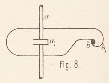 Baumann's Drahtumschalter für Telephonämter. Mit Abbildungen auf Tafel 15. Baumann's Drahtumschalter für Telephonämter. Der Umstand, daſs in den Umschaltämtern von Telephonanlagen die einmündenden Leitungen nicht beständig an dieselbe Klappe geschaltet bleiben können, an welche sie von Anfang an gelegt worden sind, daſs sie vielmehr, besonders wenn die Leitungen ihre Benutzer wechseln, nicht selten an andere Klappen verlegt werden müssen, und daſs bei solchen Verlegungen bald die Regelmäſsigkeit und Uebersichtlichkeit der Drahtführungen verloren geht, hat J. Baumann in München veranlaſst, für diese Verlegungen einen besonderen Umschalter zu entwerfen, der wenig Raum einnimmt und wenig kostet. Der in Fig. 7 Taf. 15 abgebildete Umschalter ist auf 800 Leitungen berechnet und hat sich bei mehrmonatlichem Gebrauch in München gut bewährt. Vielleicht lassen sich derartige Umschalter auch für andere Arten der Elektricitätsanwendung mit Vortheil verwerthen. Nach Uhland's Technischer Rundschau, 1888 * S. 52, ist aus Doppel--Eisen ein rechteckiger Rahmen derart gebildet, daſs die vier Stege in einer Ebene liegen und die Flanschen auf jeder Seite des Rahmens je vier Nuthen bilden. In diese Nuthen sind, dieselben völlig ausfüllend, Holzleisten aus bestem, mit groſser Sorgfalt verleimten Buchenholz eingefügt. Diese Holzfutter dienen zur Befestigung eines Systemes von blanken, 0mm,8 starken Siliciumbronzedrähten, welche, einander rechtwinkelig kreuzend, parallel zu den Rahmenseiten gezogen sind. Die sämmtlichen wagerechten Drähte liegen in einer Ebene und die sämmtlichen senkrechten Drähte in einer zweiten Ebene, welch letztere um 2cm von der ersteren nach vorn absteht. Die sämmtlichen Drähte, sowie deren Befestigungspunkte sind gegen einander isolirt. Von den beiden Befestigungspunkten eines Drahtes ist immer der eine so eingerichtet, daſs an demselben mittels einer Schraube das eine der beiden Stücke des Einführungsdrahtes angelegt werden kann und daſs ferner mittels der Befestigung die Spannung des Bronzedrahtes regulirt werden kann. Zu diesem Zwecke besteht das Befestigungsstück aus einem in das Holzfutter eingetriebenen, unten mit sehr feinem Gewinde versehenen Metallstifte von 5 bis 6cm Länge und 0,5 bis 0cm,8 Dicke von ähnlicher Form, wie sie zur Befestigung und Regulirung der Saiten in einem Claviere dienen. Der Metallstift ist am oberen Ende durchbohrt, um das Ende des Bronzedrahtes aufnehmen zu können. Für den Anschluſs des Einführungsdrahtes ist in den Kopf des Stiftes ein Gewinde eingedreht, welches eine Schraube zum Festklemmen des Einführungsdrahtes aufnimmt. Die Spannung der Drähte kann zwischen 13 und 16k betragen. Der Abstand der einzelnen derselben Ebene angehörigen Drähte kann zwischen 3 und 5mm gewählt werden. Zur Sicherung dieses Abstandes legt sich jeder einzelne Draht an je einen kleinen Metallstift, welcher in einen die Befestigungshölzer überragenden seitlichen Holzsteg eingeschlagen ist. Diese Stifte sind selbstverständlich ebenfalls sorgfältig von einander isolirt. Die Bronzedrähte bilden somit ein engmaschiges Gitter, dessen einzelne Fäden auf ihre ganze Ausdehnung von einander isolirt sind. Diese Fäden entsprechen nun den Metallschienen in den für telegraphische Zwecke im Gebrauche befindlichen Linienwechseln. An die wagerechten Drähte sind nun in der in Fig. 7 dargestellten Ausführung die zu den Luftleitungen gehenden Zweige der Einführung, an die senkrechten die zu den Umschaltern gehenden Zweige der Einführung angelegt. Ein Theil der senkrechten Drähte dient ferner dazu, die direkten Verbindungen zweier Luftleitungen mit Ausschluſs des Vermittelungsamtes zu bewirken. In der Figur sind als Einführung Luftkabel dargestellt, die in Blechkästchen endigen, welche die Schlieſsstelle zwischen den einzelnen Kabeladern und den zu den Blitzschutzvorrichtungen und durch letztere zu den wagerechten Drähten des Umschalters führenden Drähten umschlieſsen und mit Isolirmasse ausgegossen sind. Zur Verbindung der wagerechten Drähte des Umschalters mit den senkrechten dienen kleine, aus Messingblech gestanzte Haken; ein solcher ist in Fig. 8 von der Seite gesehen dargestellt. Der aus der Ebene des Bleches hervorgedrückte seitliche Vorsprung a1 faſst den senkrechten Draht a, während das nach abwärts zu einem Haken geformte Ende b1 des Bleches sich in den wagerechten Draht b einhängt. Die beiden Theile des Hakens, an welche die Drähte anzuliegen kommen, sind 1,0 bis 1cm,5, je nachdem ein Drähtepaar in der Mitte oder mehr an den Rändern des Umschalters zu verbinden ist, von einander entfernt, so daſs die zwei Drähte, welche unverbunden, wie erwähnt, 2cm von einander abstehen, beim Verbinden durch den Haken einander genähert werden, wodurch deren Spannung etwas vermehrt wird. Während nun durch die Haken jeder zu den Klappen des Vermittelungsamtes führende Zweig mit jedem zu den Luftleitungen gehenden Zweige der Einführung verbunden werden kann, ist es auch möglich, je zwei der letzteren direkt mit einander zu verbinden. Es genügt hierzu, zwei Haken mit ihren vorderen Enden in die zugehörigen wagerechten Drähte, mit ihren hinteren Enden in einen gemeinschaftlichen senkrechten Draht einzuhängen. Damit ist aber auch die Möglichkeit gegeben, die beiden so verbundenen Luftleitungen rasch wieder zu trennen und jeden einzelnen Zweig wieder anderweit zu verbinden. Dies ist namentlich in Störungsfällen zur raschen Entscheidung der Frage, welcher der verbundenen Zweige gestört ist, von groſsem Vortheile. Wird nämlich einer der senkrechten Drähte an eine Verbindung zu den Meſsinstrumenten gelegt, so genügt es, den einen Verbindungshaken der direkten Verbindung aus dem gemeinschaftlichen Senkrechtdrahte auszuhängen und in den zum Untersuchungsinstrument führenden einzuhängen, um in wenigen Augenblicken zu ermitteln, in welchem Leitungszweige der Fehler liegt. Das in Fig. 7 dargestellte Modell hat eine 