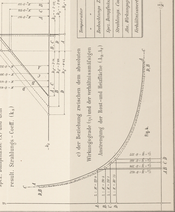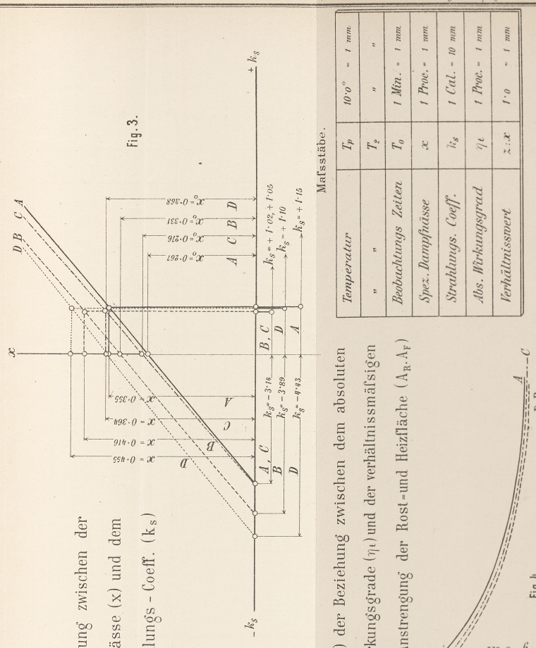 Ueber Versuche zur Klarstellung des Wirkungsgrades des Locomotivkessels; von Prof. H. Gollner in Prag. (Schluſs des Berichtes S. 494 d. Bd.) Mit Abbildungen auf Tafel 1 und 2. Gollner, Klarstellung des Wirkungsgrades des Locomotivkessels. Die Beziehungen zwischen der specifischen Dampfnässe (x) und dem Strahlungsverluste (W7 ) bezieh. dem Werthe (Ks), sowie der erreichten Verdampfungsziffer (Mn : B) lassen sich in folgender Weise sicherstellen: Bezeichnet man die Summe der Wärmeverluste (W1 bis + W6) + (W9 + W10 ) mit ΣW und wird die Gröſse H – ΣW = ΔW gesetzt, so ist ΔW – (W7 + W8 ) die von 1k Brennstoff gelieferte Nutzwärme, welche sich wieder ausdrückt durch \frac{M_n}{B}\,(1-x)\,(\lambda-q_0) , wobei (Mn die producirte Gewichtsmenge Dampf von der specifischen Nässe = x bedeutet, und wobei Mt = Mn(1 – x) die unter gleichen Umständen erzeugte Gewichtsmenge trockenen Dampfes ausdrückt. Die mit Benutzung der Werthe W7 und W8 dargestellte Beziehung: \Delta\,W-\left(\frac{O}{B}.K_s.T_b.\Delta+\frac{M_n}{B}.x.q_w\right)=\frac{M_n}{B}.(1-x)\,(\lambda-q_0) kann nach mehrfachen Umwandlungen ausgedrückt werden durch: x=\frac{M_n\,(\lambda-q_0)-B\,\Delta\,W}{M_n\,[\lambda-(q_w+q_0)]}+\frac{O.T_b.\Delta}{M_n\,[\lambda-(q_w+q_0)]}\,K_s. Diese Gleichung entspricht der allgemeinen Form x = A + C . Ks als Gleichung einer Geraden in specieller Lage gegen das Coordinatensystem, welche aus den Diagrammen Fig. 3 Taf. 2 zu ersehen ist. Die entwickelte Gleichung kann auch geschrieben werden: XVII) x=\frac{O.T_b.\Delta}{M_n[\lambda-(q_w+q_0)]}.K_s+\frac{(\lambda-q_0)-\left(\frac{B}{M_n}\right)\,\Delta\,W}{\lambda-(q_w+q_0)}; sie laſst erkennen, daſs sich die specifische Dampfnässe aus 2 Theilen additionell zusammensetzt, von welchen die Gröſse des ersten Theiles von den Strahlungsverhältnissen der Kesseloberfläche (W7 ) abhängig ist, während der zweite und im Allgemeinen wesentlich gröſsere Theil eine Function des Betriebes bezieh. des Wirkungsgrades t) der ganzen Kesselanlage ist. Zur Verminderung der Dampfnässe für den Locomotivkessel führt: a) eine geringe wärmedicht gehaltene Kesseloberfläche O, welche einer hohen Lufttemperatur (t) ausgesetzt ist, wobei die Bruttofahrzeit möglichst nahe der Nettofahrzeit Tn kommen soll; b) ein hoher Wirkungsgrad der Kesselanlage ηt selbst, d.i. wegen ΔW groſs, H – ΣW groſs und ΣW klein, daher (B : Mn) klein, d.i. (Mn : B) groſs, nämlich möglichste Schonung der Kesselanlage durch Einleitung einer geringen Anstrengung (AF und AR) der Heiz- und Rostfläche zur Erreichung einer hohen Verdampfungsziffer (Mn : B). Für den Locomotivkessel können die eben angeführten Bedingungen nicht erfüllt werden. Zunächst ist es nicht möglich, den Werth Ks Cal. besonders günstig zu stellen, da nur eine Metallverschalung der Kessel unter Anwendung einer stagnirenden Luftschichte zwischen dieser und der Kesselwandung (oder noch unter Verwendung einer Filzlage, dichte Leinwand) zulässig erscheint, weiter sind die Werthe Tb und t von äuſseren, vielfach sehr ungünstig wirkenden Verhältnissen, die keine Abänderung zulassen, abhängig. Im Allgemeinen stellt sich die absolute Gröſse Oqm oder der Verhältniſswerth O : Mn nicht sehr unvortheilhaft, hingegen werden diese günstigen Einflüsse von den mehrfachen durchaus schädlichen Einwirkungen der übrigen maſsgebenden Gröſsen wesentlich eingeschränkt. Im Weiteren ist zu berücksichtigen, daſs im Allgemeinen ein hoher Wirkungsgrad ηt des Locomotivkessels wegen der unvermeidlichen Forcirung seiner Heiz- und Rostfläche nicht zu erzielen ist, in Folge dessen gleichfalls ein höherer Werth (x) für die specifische Dampfnässe in Aussicht zu nehmen sein wird. Aus obiger Gleichung geht weiter hervor, daſs die specifische Dampfnässe x für Ks = O, d.i. unter der Voraussetzung, daſs keine schädliche Strahlung nach auſsen stattfände, den kleinsten möglichen Werth, d.i. x\ \mbox{min.}=\frac{(\lambda-q_0)-\left(\frac{B}{M_n}\right)\,\Delta\,W}{[\lambda-(q_w+q_0)]} erreicht; die specifische Dampfnässe x wird = O für K_s=-\frac{M_n\,(\lambda-q_0)-B\,\Delta.W}{O.T_b.(w-t)} d.h. wenn der Strahlungscoefficient Ks den Charakter eines Wärmedurchgangscoefficienten von Luft gegen das Kesselinnere annimmt, also wenn der Kesseloberfläche von auſsen Wärme zugeführt werden würde. Aus den eben gelieferten Darstellungen geht endlich hervor, daſs die Erzeugung von trockenem Kesseldampf bei Locomotiven unmöglich ist, daſs bei stationären Dampfkesselanlagen hingegen unter dem Einflüsse des erhitzten Mauerwerkes, wenigstens zweitweise, + Ks in – Ks übergehen kann, wodurch der Werth x sehr nahe oder gleich Null würde, wenn eben die übrigen schon früher hervorgehobenen Bedingungen erfüllbar sind und auch effectiv erfüllt werden. Der Locomotivkessel ist hiernach trotz seiner günstig angeordneten inneren Heizfläche betreffend die Wärmeverluste durch Strahlung und in Folge Dampfnässe im Nachtheile gegenüber den gut eingemauerten stationären Dampfkesseln, wie auch die für die vier Versuchsfahrten A bis D berechneten Werthe von x nachweisen; die zu Berechnung von W8 und des folgenden Correctionsfactors ξn nöthigen Hilfsgröſsen sind in der Tabelle XIX zusammengestellt. Tabelle XIX. Art der Feuerung Nepilly-Feuerung Gewöhnliche Plan-feuerung Zeichen der Versuchsfahrt A B C D Hilfs-Gröſsen O . Tb . Ks . ΔMn[λ – (qw + q0)]Mn(λ – q0 )ΣWΔWB . ΔW   188121,02192755,93355149,61841,52527,52767612,5   205520,72396201,73357705,02351,32504,72562308,1   243805,62782082,53853946,52447,52033,53086853,0   200718,02419057,23362977,22575,71960,32969978,0 Minimale specifische   Dampfnässe x 0,267 0,331 0,276 0,368 Effective specifische   Dampfnässe x 0,355 0,416 0,364 0,451 Gewichtsmenge trocke-   ner Dampf Mt = Mn(I – x) 3339,6 3043,5 3787,3 2879,0 Verhältniſswerth Mt : Mt 1,14 1,18 1,14 1,20 Gewichtsmenge  trockenen Dam-   pfes für kmt 1'' Bruttofahrz.Nett