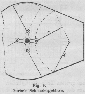 Als eine „Verbesserung“ oder Neuerung am Ventilator ist Ernst Garbe's (Berlin) Schleudergebläse mit gelenkig angeschlossenen Flügeln (D. R. P. Nr. 43852