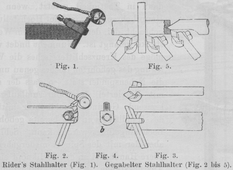 Rider's Stahlhalter (Fig. 1). Gegabelter Stahlhalter (Fig. 2 bis 5).