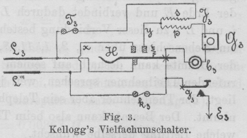Rollen des Elektromagnetes der Klingel k3 hindurch mit der Achse von H; von letzterer führt auch noch ein Draht nach dem Hebel des Ruftasters