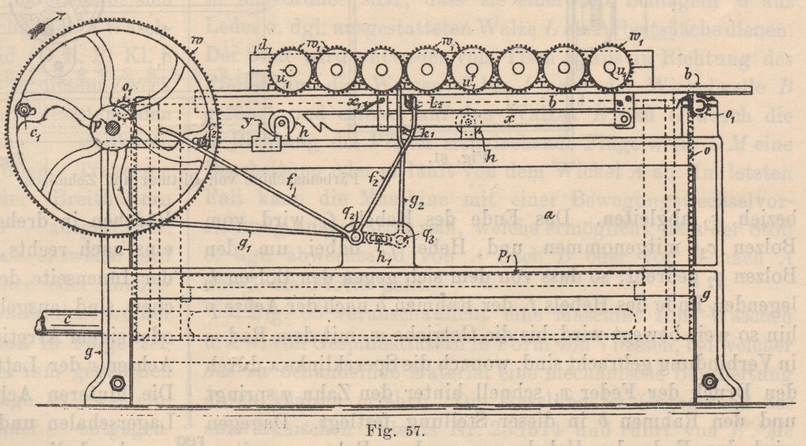Sperrklinke x aus dem Zahn y gehoben worden ist. Dagegen wird der Rahmen b mittels der auf der andern Seite des Gestells angebrachten Räder q1, r2 und t in die Ausgangsstellung wieder zurückgebracht, sobald