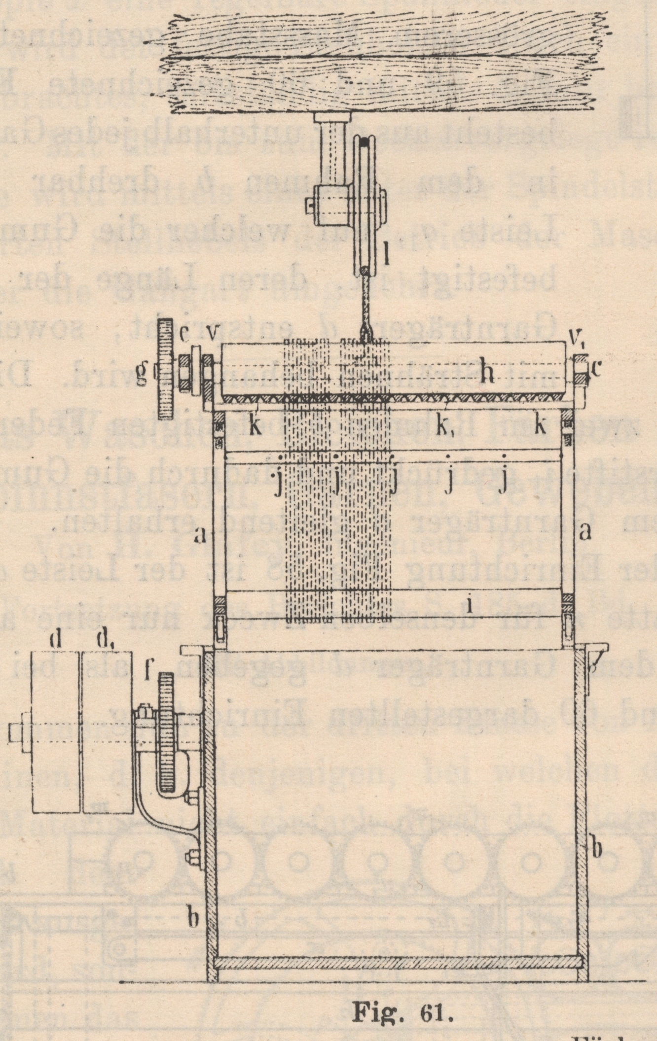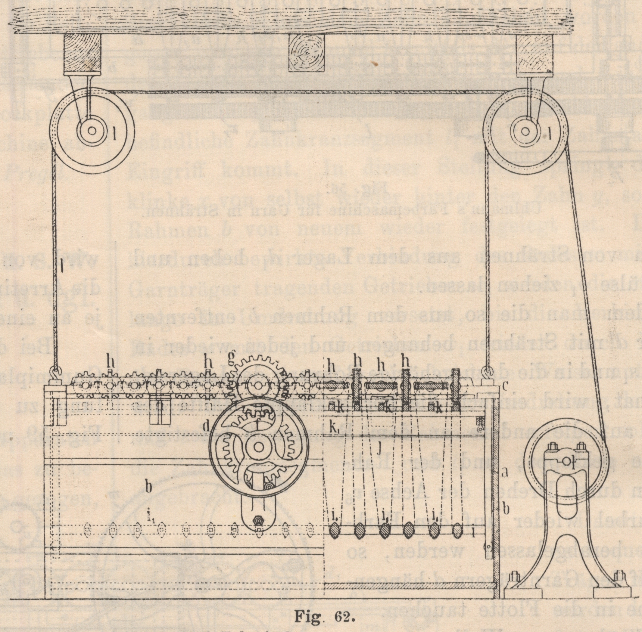 um Bolzen i drehbaren Rahmens d, an welchem sämmtliche Ketten oder Schnüre hh befestigt sind. Dicht unterhalb der Walze B befindet sich eine Rinne a, welche das