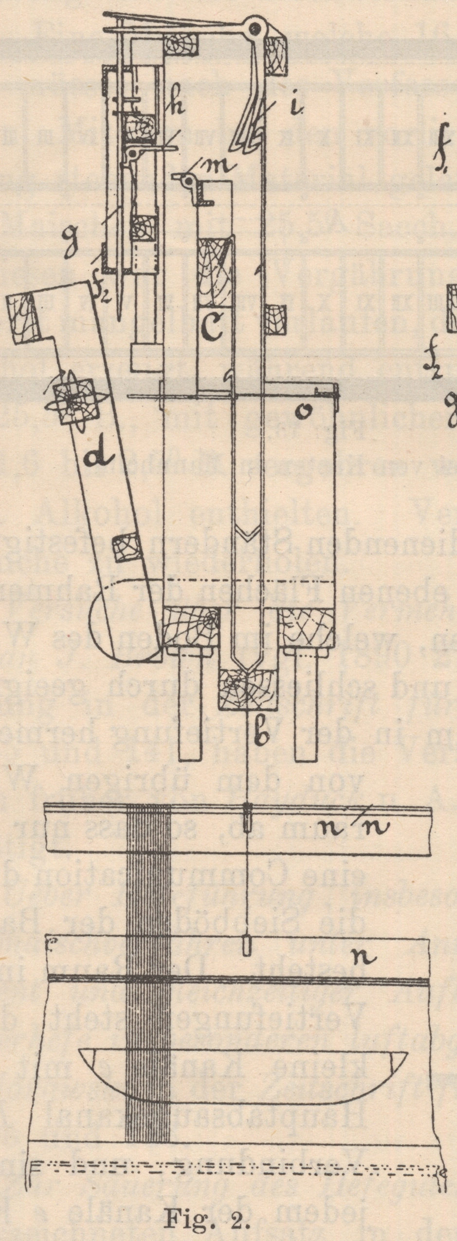 entsprechenden Nadeln in die Höhe gedrückt und mittels der Hebelchen h, welche durch Federn in eingefeilte Vertiefungen der