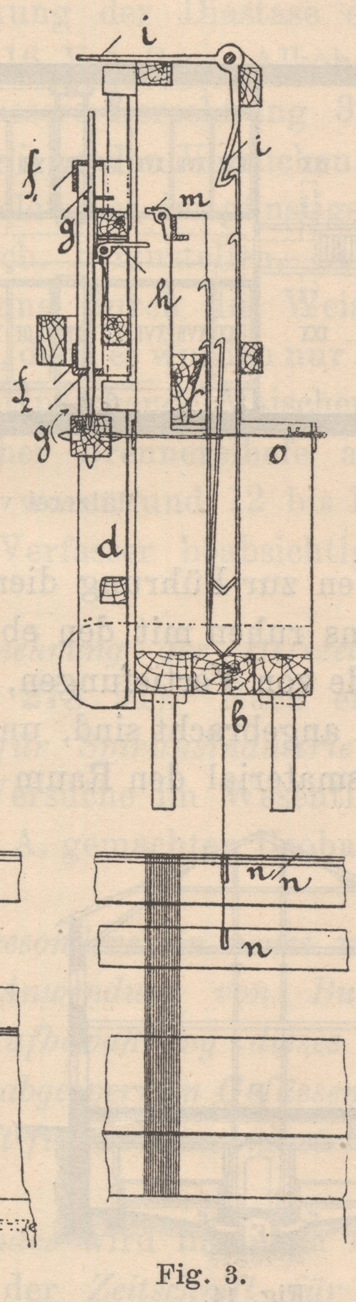 Messer c bewegt sich mittels des Verbindungsarmes e (Fig. 1) ein Schlitten f in lothrechter Richtung an zwei Führungsstangen,