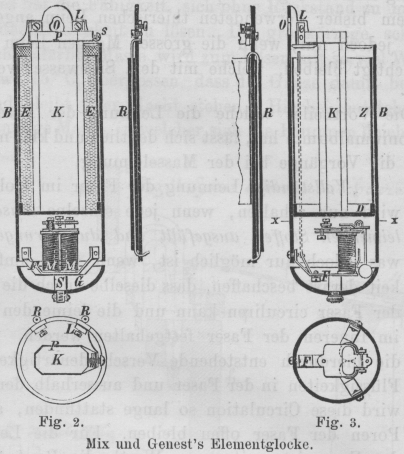 Das dabei verwendete neue Trockenelement besteht aus einer geschnittenen Gaskohle K (Fig. 2 und 3), der Erregermasse E und einem Zinkcylinder Z, und befindet sich in einem cylindrischen Becher B aus Papiermache o. dgl., dessen Boden D