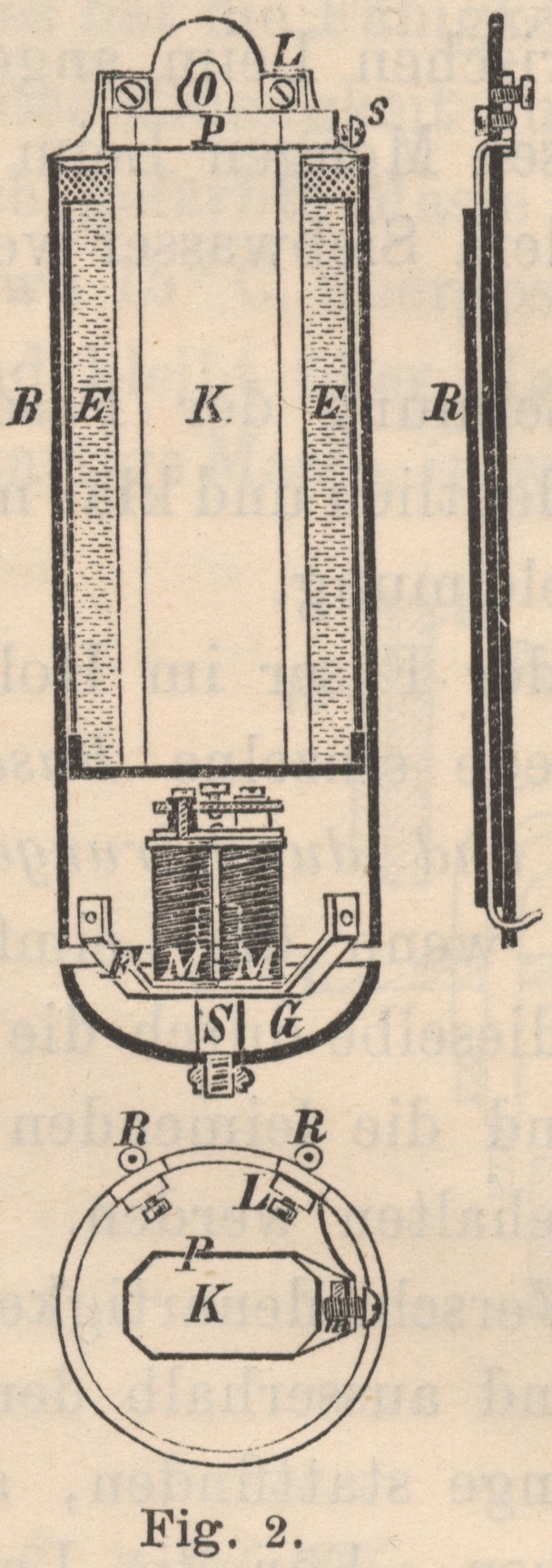 Die Verbindung der Kohle mit der Leitung stellt ein Kupferband P her, welches die Kohle K