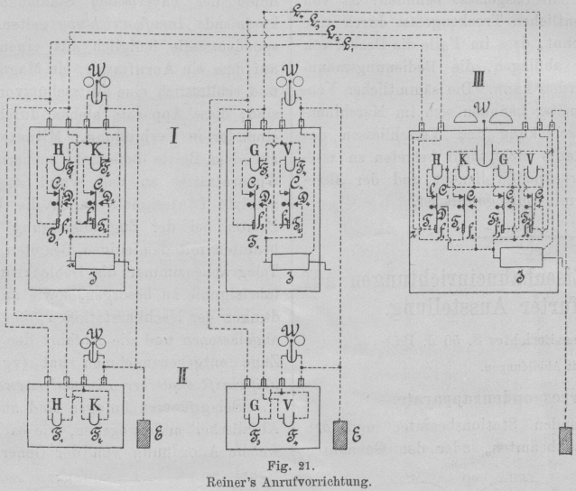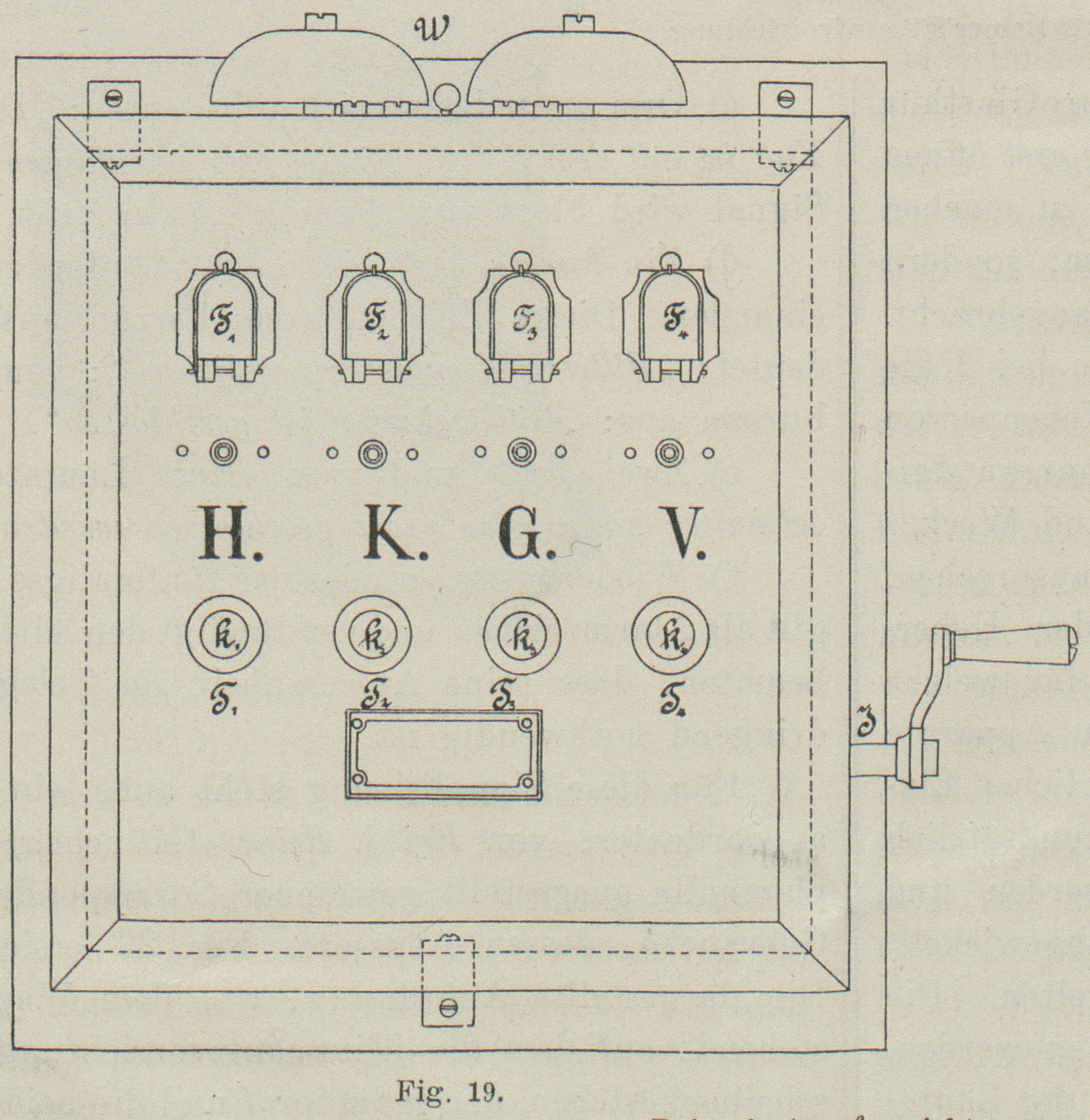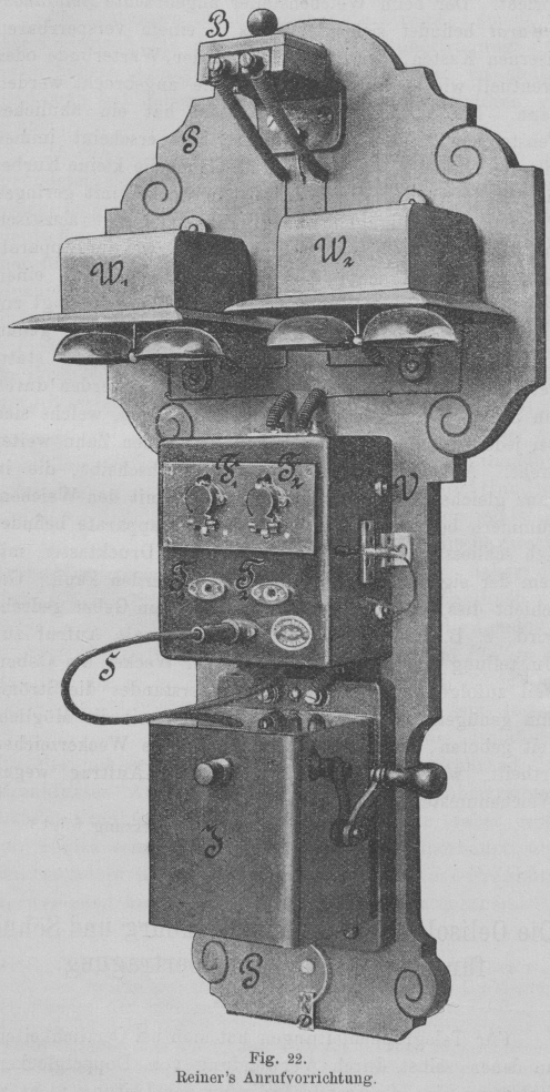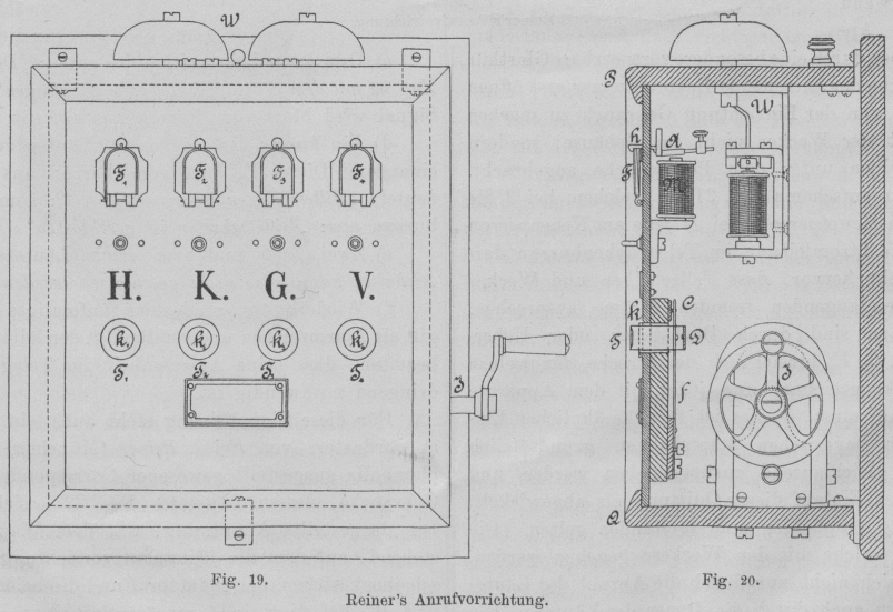 Textabbildung Bd. 283, S. 105Reiner's Anrufvorrichtung. Bei grösseren Anlagen sind ausser den Weckern noch Abfallscheiben