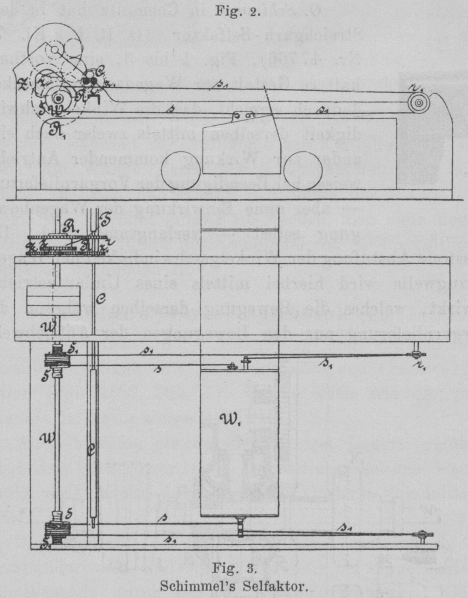 Textabbildung Bd. 283, S. 148Schimmers Selfaktor. Bei dem in Fig. 1 bis 3 dargestellten Selfaktor