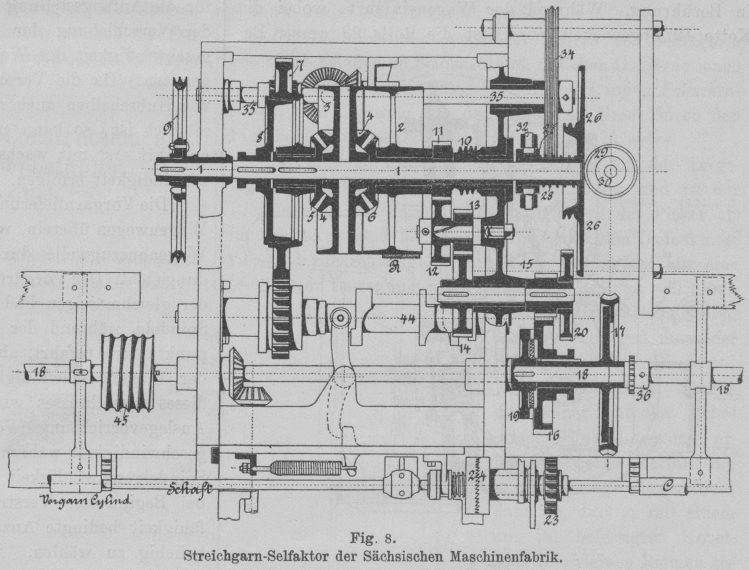 Textabbildung Bd. 283, S. 151Fig. 8.Streichgarn-Selfaktor der Sächsischen Maschinenfabrik. Im vorliegenden Falle ist zur Bestimmung der Umlaufsgeschwindigkeiten der