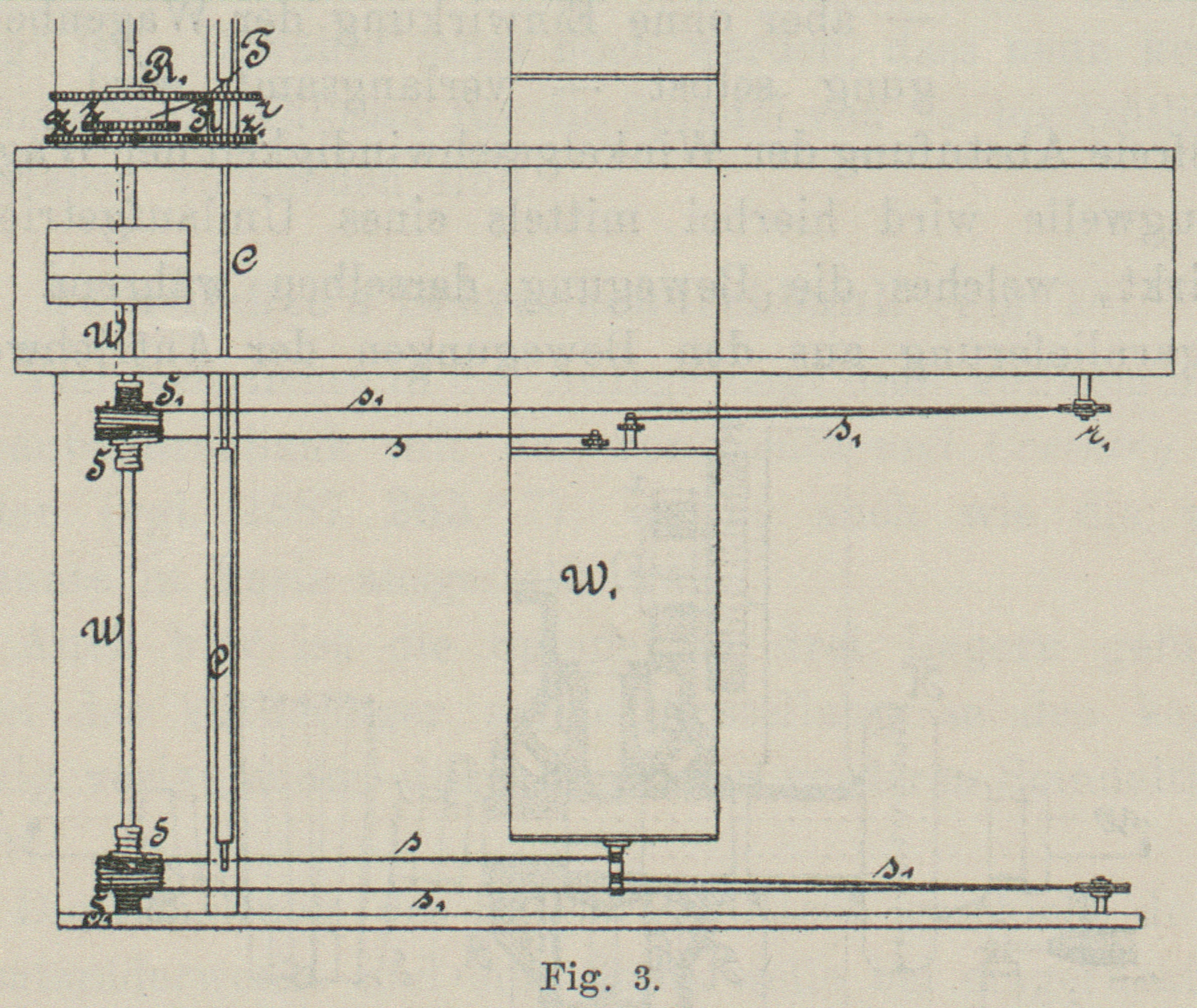 während welcher das Wagenseil auf dem grossen Schraubengange der Schnecke S läuft. Wird nun der Cylinder C ausgeschlossen, die Kuppelung K1 also ausgerückt, so bleibt das Rad R1 stehen und die