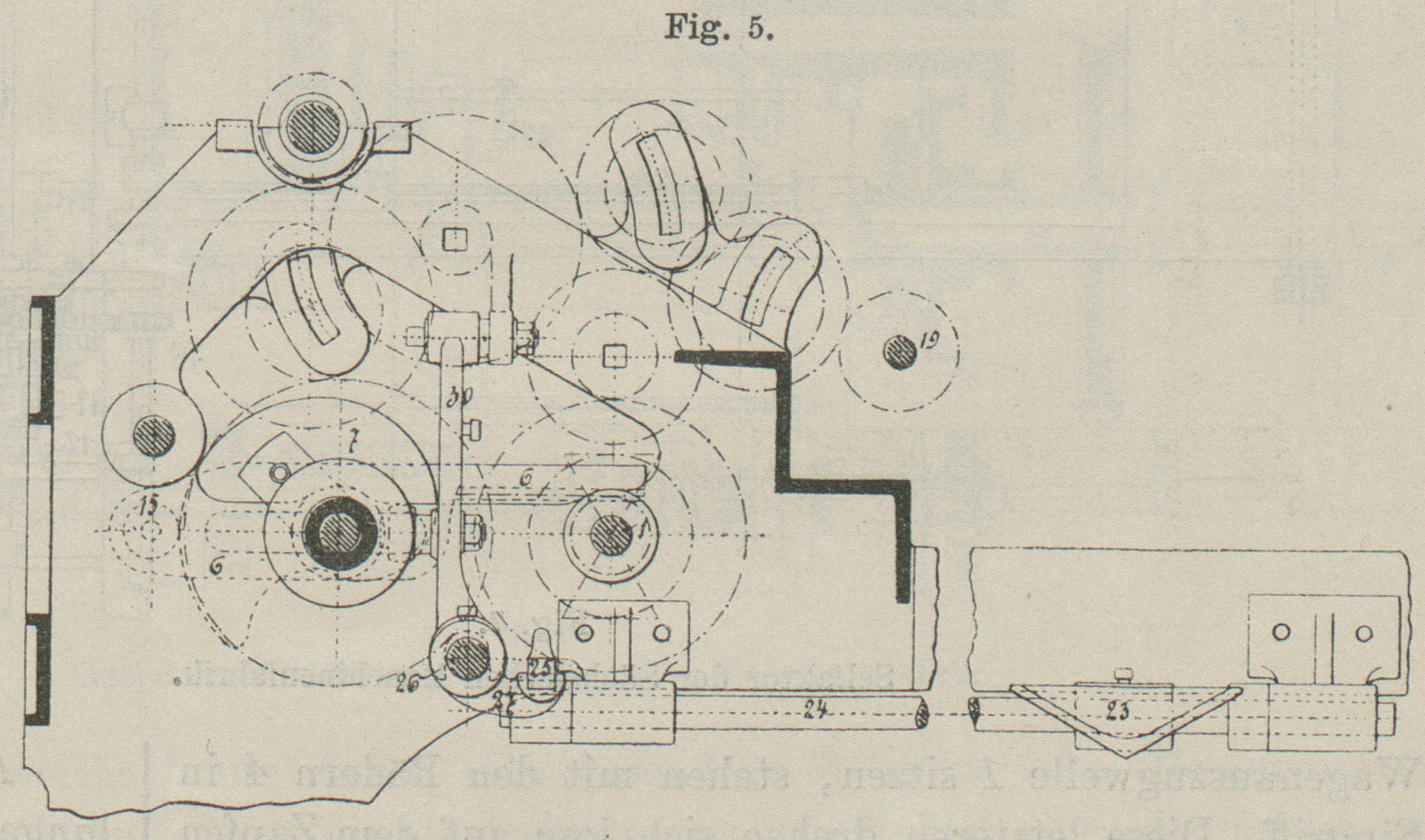 Umdrehungen umgesetzt, welche dem jeweilig von der Rolle 29 berührten Durchmesser der Scheibe 26 entsprechen und welche durch die Kuppelung 16 19 auf die Wagenauszugwelle, durch die Räder 16 15 20 21 22 23 und die Kuppelung 24 auf den Cylinder C und