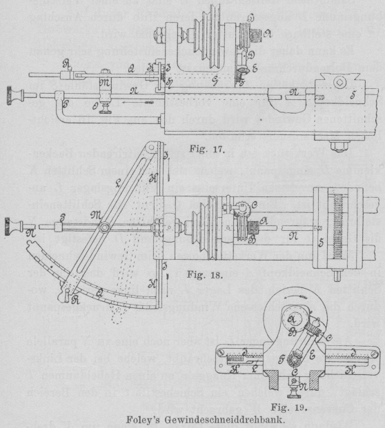 Textabbildung Bd. 283, S. 158Foley's Gewindeschneiddrehbank. Der Supportschlitten S ist ferner durch einen