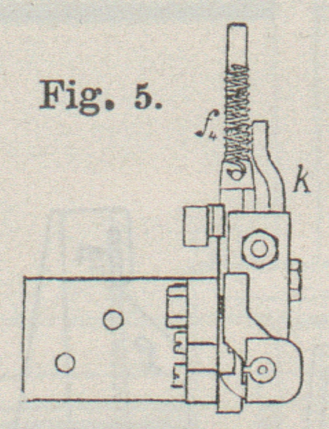deren Backen durch eine Drahtfeder f1 geöffnet, von einer Kegelkopfstange B mit Drahtfeder f2 geschlossen wird (Fig. 1 und 2).