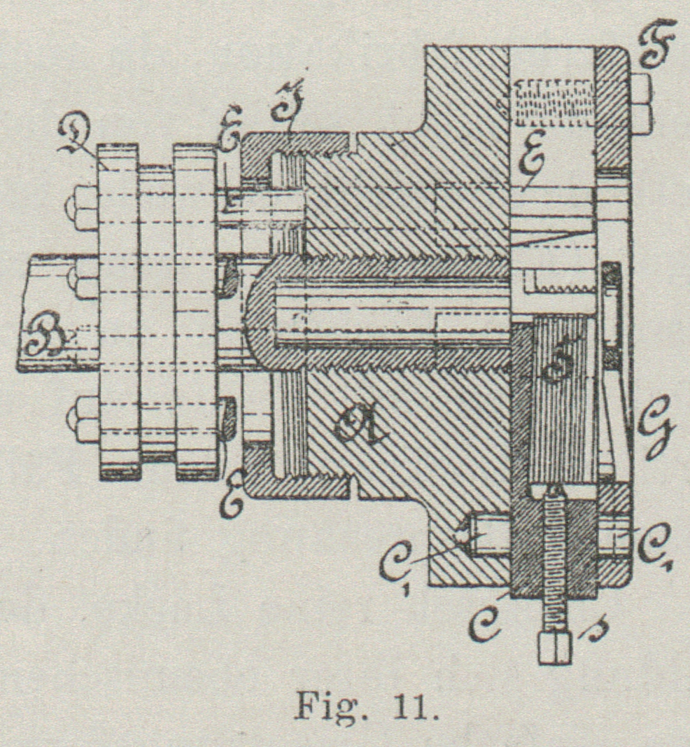 Auf die volle, nur am Vordertheile etwas ausgebohrte Hauptspindel B (Fig. 11 und 12) ist der