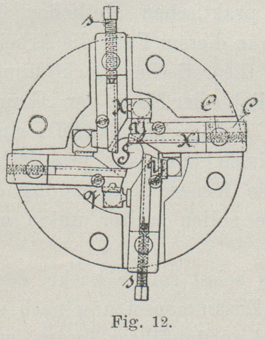 Das Werkstück ist in einer selbstcentrirenden Backenklemme H eingespannt, welche sich auf einem Schlitten K befindet, an dessen Unterseite ein Führungslager L angeschraubt ist. Ein Handhebel Q dient zur