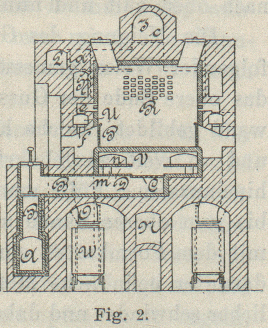 der Rohstoffe zu benutzen, laufen zur Abführung dieser Producte unter H zwei wagerechte Kanäle X, welche mit kleinen