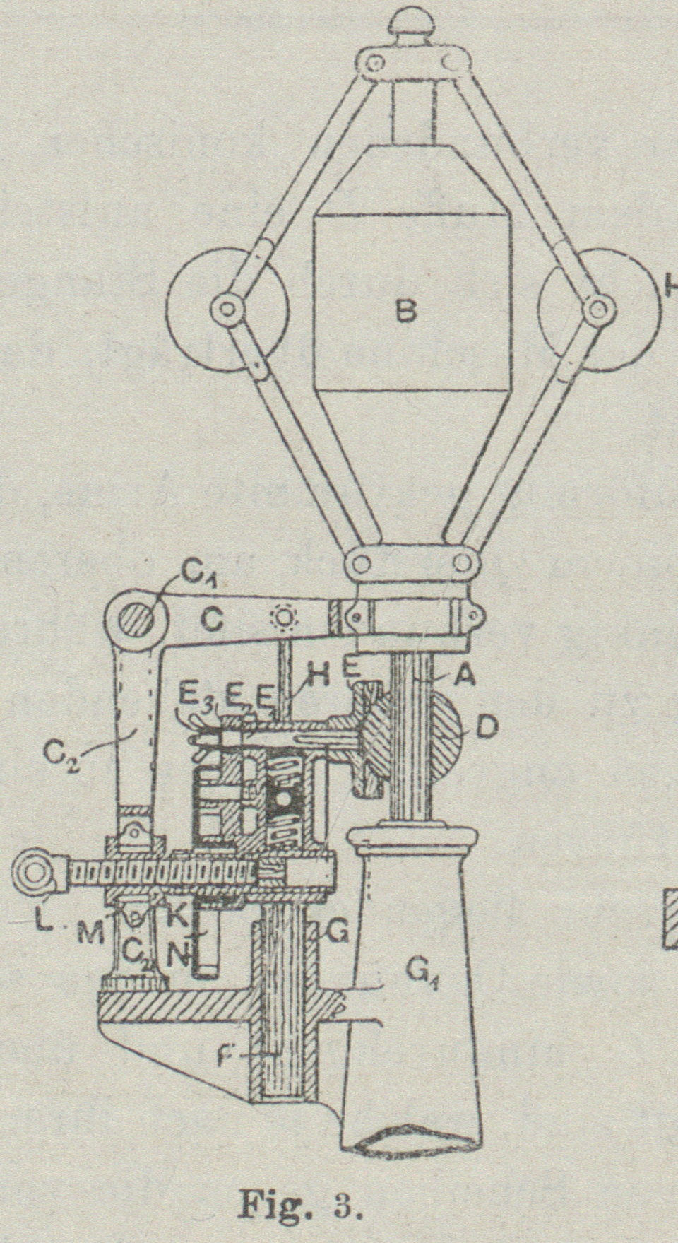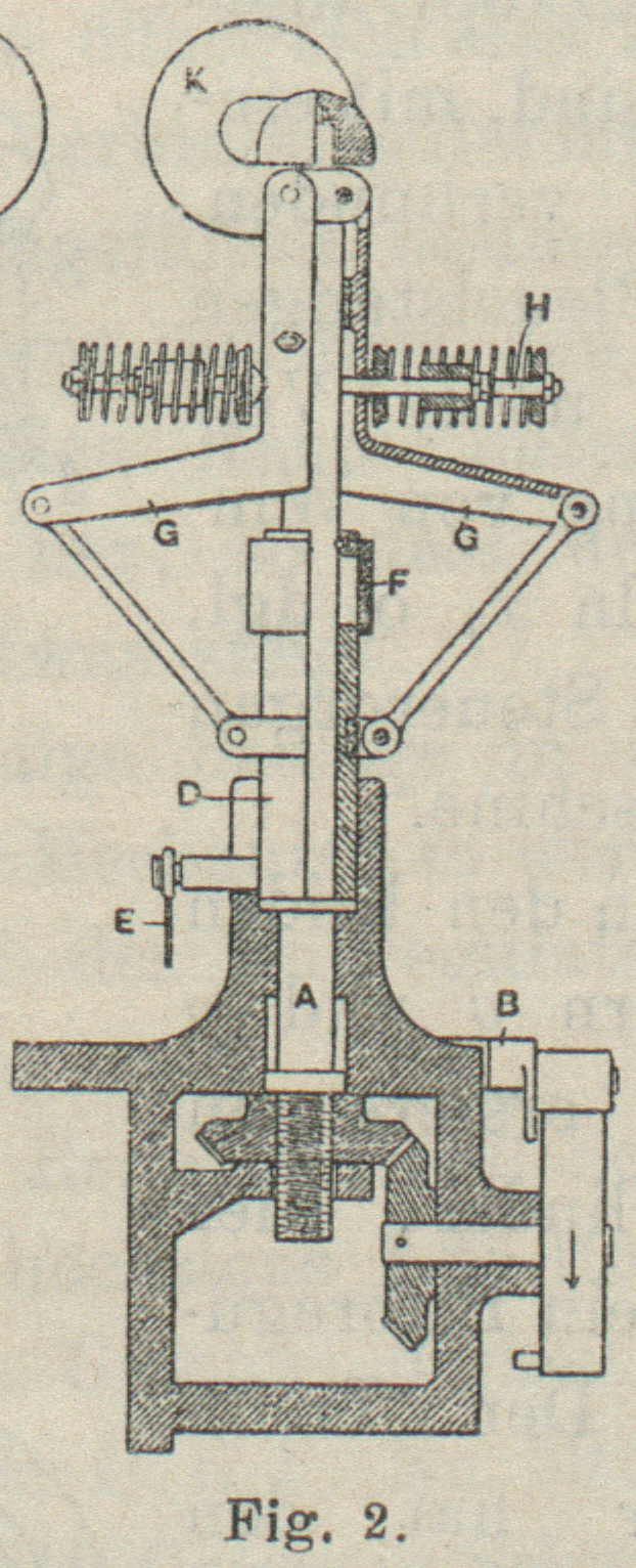 K ist ein auf dem oberen Theil der Spindel A befestigter Gewichtsträger, welcher mit den Armen G in der in Fig. 1 ersichtlichen