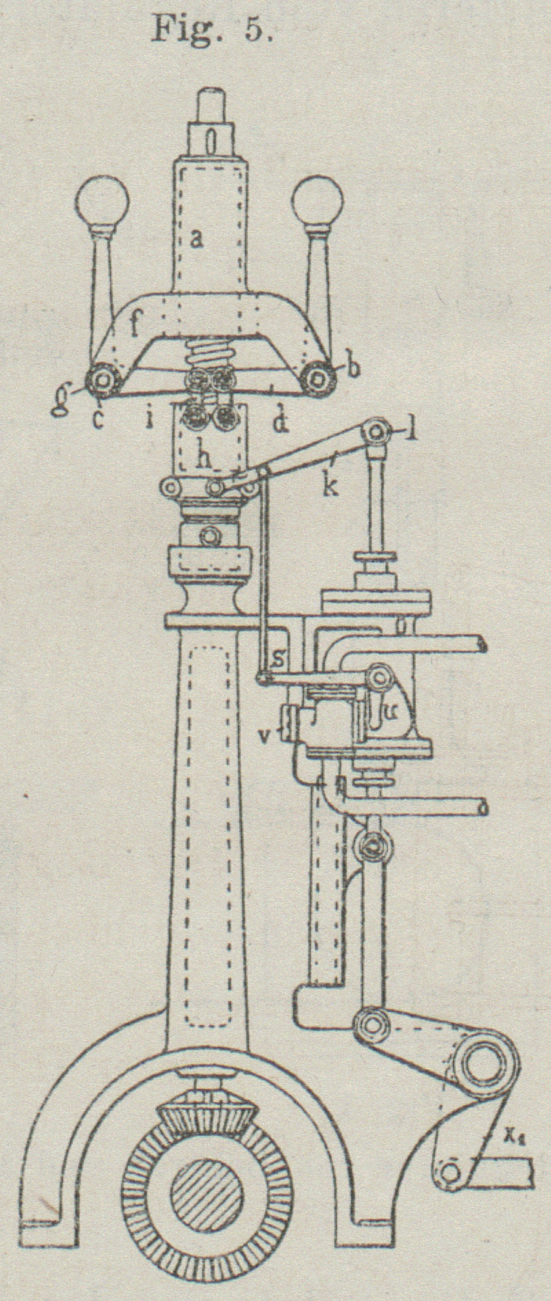 Drehung gesetzt wird; letztere überträgt sich mittels Universalgelenkes x auf eine zweite Spindel und dadurch auf Kegelräder