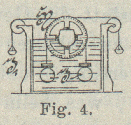 Rolle K sich drehen kann. Ueber die Rolle K wird ein leichter biegsamer Faden 4 gelegt, an dessen Enden die mit Gewichten gefüllten