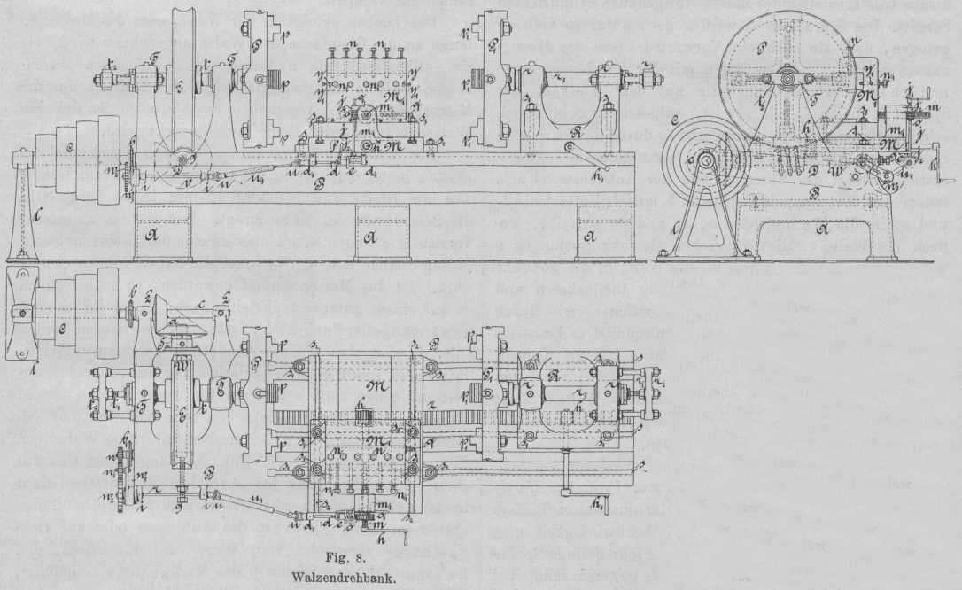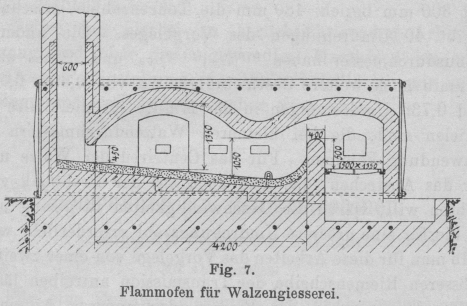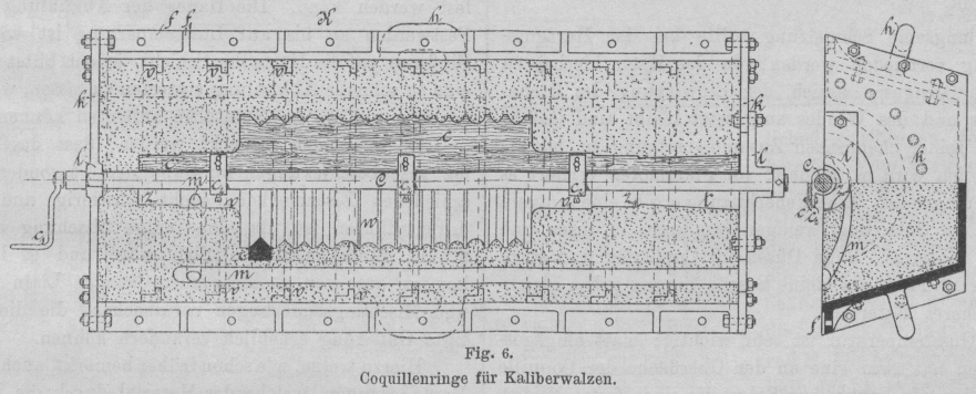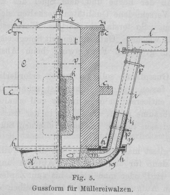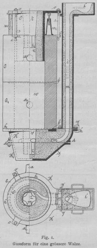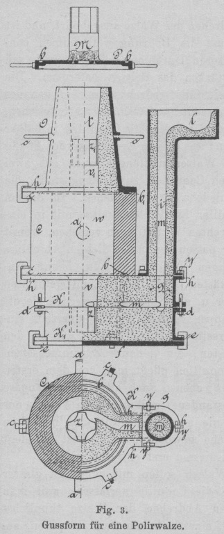 Die Darstellung des Hartgusses mit besonderer Berücksichtigung der Hartgusswalzen. Mitgetheilt von Fabrikdirector Georg Wirth in Wien. (Schluss des Berichtes S. 1 d. Bd.) Mit Abbildungen. Die Darstellung des Hartgusses mit besonderer Berücksichtigung der Hartgusswalzen. Für die Herstellung der Coquillen müssen eine Reihe von Regeln, die sich aus der Praxis ergeben haben, beobachtet werden, so ist hierzu nur ein sehr festes, feinkörniges Eisen mit wenig Schwindung zu nehmen, denn die plötzliche Erhitzung und die auftretende ungleiche Spannung macht sie geneigt zu reissen. Auch ist die Dauer der Coquille von nur kurzer Zeit, wenn nicht festes Eisen verwendet wurde, die Oberfläche wird sonst beim Gebrauche leicht rissig und blättert sich ab. Bei uns findet das Eisen der Concordiahütte zu Werfen als ein sehr geeignetes Material für Coquillen hauptsächlich Anwendung; im Siegerland werden gleichfalls für Coquillenguss geschätzte Roheisensorten erblasen. Die Fleischstärke der Coquille richtet sich nach dem Durchmesser der Walze, für welche sie dient. Als empirische Formel für die Bestimmung einer geeigneten Fleischstärke d der Coquille kann für Walzen mit Durchmesser D < 220 mm d=\frac{D}{2,5} genommen werden. Für Walzen unter 220 mm Durchmesser ist die Fleischstärke zu erhöhen. Nachstehende Tabelle gibt die Coquillenwandstärken bei gegebenen Walzendurchmessern: Dmm dmm Dmm dmm Dmm dmm 100 50 210   90 400 160 110 55 230   95 425 170 120 60 250 100 450 180 130 65 275 110 475 190 150 70 300 120 500 200 160 75 325 130 525 210 180 80 350 140 550 220 200 85 375 150 600 240 Um dem blossen Drucke des Eisens beim Eingiessen zu widerstehen, würden allerdings geringere Wandstärken ausreichend sein, aber die Ausdehnung bei der Erhitzung übt einen gewaltigen Druck auf die Rückseite der Coquille aus, der schwache Coquillen unbedingt zum Reissen bringt; man versichert die Coquille zum Schütze gegen Springen oft noch durch angelegte schmiedeeiserne Reifen. Besonders bei den grösseren Durchmessern ist ein Einhalten der angegebenen Stärken geboten, schwache Coquillen werden auch leicht unrund. Coquillen mit Wasserkühlung haben nirgends praktischen Erfolg gehabt. Die Coquille wird nach dem erforderlichen Walzendurchmesser mit Berücksichtigung des Schwindmaasses und der Zugabe für das Abdrehen der Walze ausgebohrt, und ist dabei zu beachten, dass die Bohrung vollkommen concentrisch mit dem äusseren Durchmesser der Coquille sei, weil ungleiche Wandstärken das Reissen befördern. Die Stirnseiten werden gleichfalls gedreht, um ein genaues Aufliegen und eine senkrechte Aufstellung zu ermöglichen. Zum leichteren Transporte erhalten die Coquillen in halber Höhe Zapfen angegossen; aus diesem Grunde werden häufig Coquillen für grössere Walzenbundlängen auch aus zwei oder mehreren einzelnen Coquillen zusammengestellt, die dann auch für verschiedene Längen dienen. In diesem Falle werden die Coquillen an den Stirnseiten mit in einander gehenden eingedrehten Vertiefungen versehen, womit sie genau auf einander passen und einen dichten Abschluss geben. Zur gegenseitigen Verbindung oder behufs Anschluss an die Formkästen, die die in Sand geformten Laufzapfen, Kleeblätter u.s.w. enthalten, werden sie oft mit Flanschen oder Lappen versehen, wobei einerseits eingesetzte Stifte, andererseits gebohrte Löcher, wie bei den gewöhnlichen Formkästen, ein genaues Zusammensetzen ermöglichen. Neue Coquillen pflegt man vor dem ersten Gebrauche auszugiessen, ebenso auch alte, schon längere Zeit ausser Betrieb gestandene, weil der erste Abguss aus einer neuen Coquille nie sauber ausfällt und bei alten Coquillen die Oberfläche gewöhnlich mit Rost angelegt ist, der durch das Ausgiessen erst entfernt wird. Die gegossenen Walzen sollen mit möglichst glatter und reiner Oberfläche die Coquille verlassen, weil man bei dem nachfolgenden Abdrehen der Walze thunlichst wenig wegdrehen will, einestheils am Zeit zu sparen, anderentheils um von der gerade unter der Gusshaut liegenden noch harten Kruste nicht viel zu verlieren. Das Eisen legt sich besser an die Coquille an und die Oberfläche der Walze wird glatter, wenn die Coquille angewärmt wurde; durch Einreiben der Oberfläche der Coquille mit Graphit, Syrupwasser, Terpentinöl u.s.w. sucht man dies zu erhöhen, verfolgt aber dabei noch den Zweck, die Coquille zu behüten, dass sie vom heissen Eisen angegriffen werde. Um die Coquillen zu erwärmen, werden sie entweder in die Trockenkammer gegeben, oder sie werden durch direct in die Coquillenbohrung eingehängte, mit Holzkohlen geheizte Blechöfen erwärmt. Ist die Trockenkammer bequem zur Hand, so wird diese selbstverständlich vorgezogen werden, und man hat oft zur leichteren Handhabung die Trockenkammer so construirt, dass das Ein- und Ausheben der Coquillen mittels Krahn durch die Decke der Trockenkammer erfolgen kann. Die Kästen für die Lauf zapfen, Kleeblätter, Ein- und Aufgüsse, die sämmtlich in Sand geformt werden, können auf verschiedene Weise in Verbindung mit der Coquille gebracht werden, und zeigen Fig. 3, 4 und 5 mehrere Constructionen der hierzu erforderlichen Ausrüstung. In Fig. 3 ist die vollständige Gussform für eine kleine Polirwalze ersichtlich. Der untere Laufzapfen v und das untere Kleeblatt z sind in einem zweitheiligen Kasten KK1 geformt; auf die gedrehte Flansche h dieses Kastens passt die Coquille C. Der Führungsring b sichert durch Eingreifen in den Schlitz b1 der Coquille die genau centrische Stellung; auf der Coquille steht ein röhrenförmiger Kasten O, der den oberen Laufzapfen v1, das obere Kleeblatt z1 und den Aufguss t eingeformt enthält. Dieser Kasten O besitzt gleichfalls eine gedrehte Flansche h mit gleichem Führungsring b, womit er in den Schlitz b1 der Coquille passt. Zur festen Verbindung dieser drei Theile kommen über die an die Coquille angegossenen Lappen c und ebensolchen an den Ober- und Unterkasten Klammern, die man verkeilt. Der zweithei