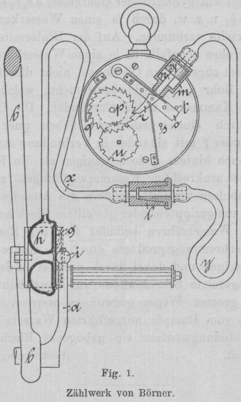 die Feder g gegen die Gabel b drückt und dadurch die in dem zwischengelagerten Gummibeutel h befindliche Luft comprimirt. Die aus dem Beutel h verdrängte Luft treibt den Kolben K im Zählwerk vor sich her, indem die Compression nach