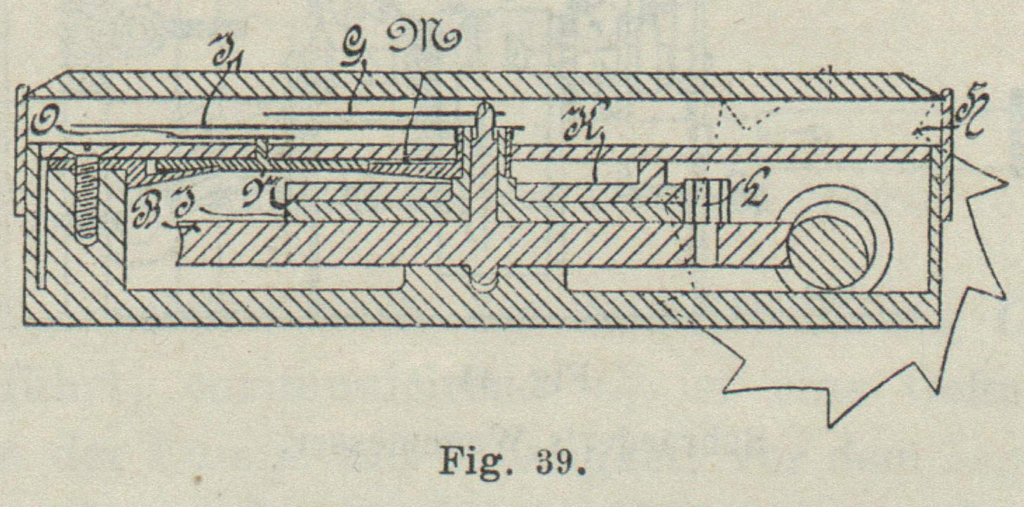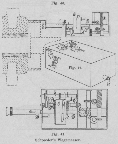 seiner Umdrehungen zwei zurückgelegte Kilometer an. Auf dem Schneckenrade B (Fig. 38 und 39) liegt lose das