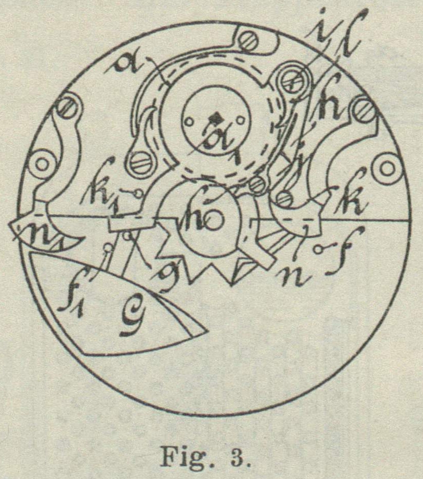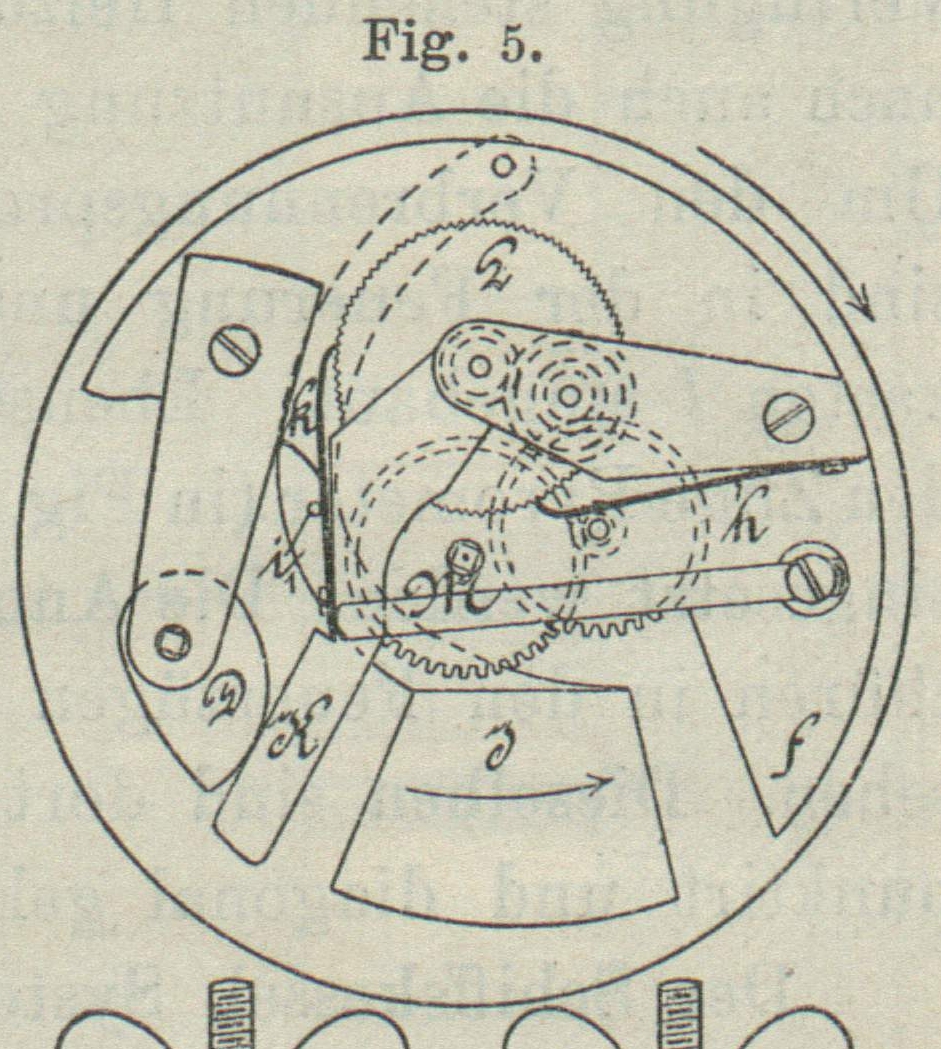 Schaltung des Anzeigewerkes wird bewirkt durch eine am Hebel K (Fig. 5)