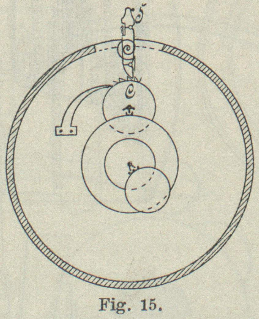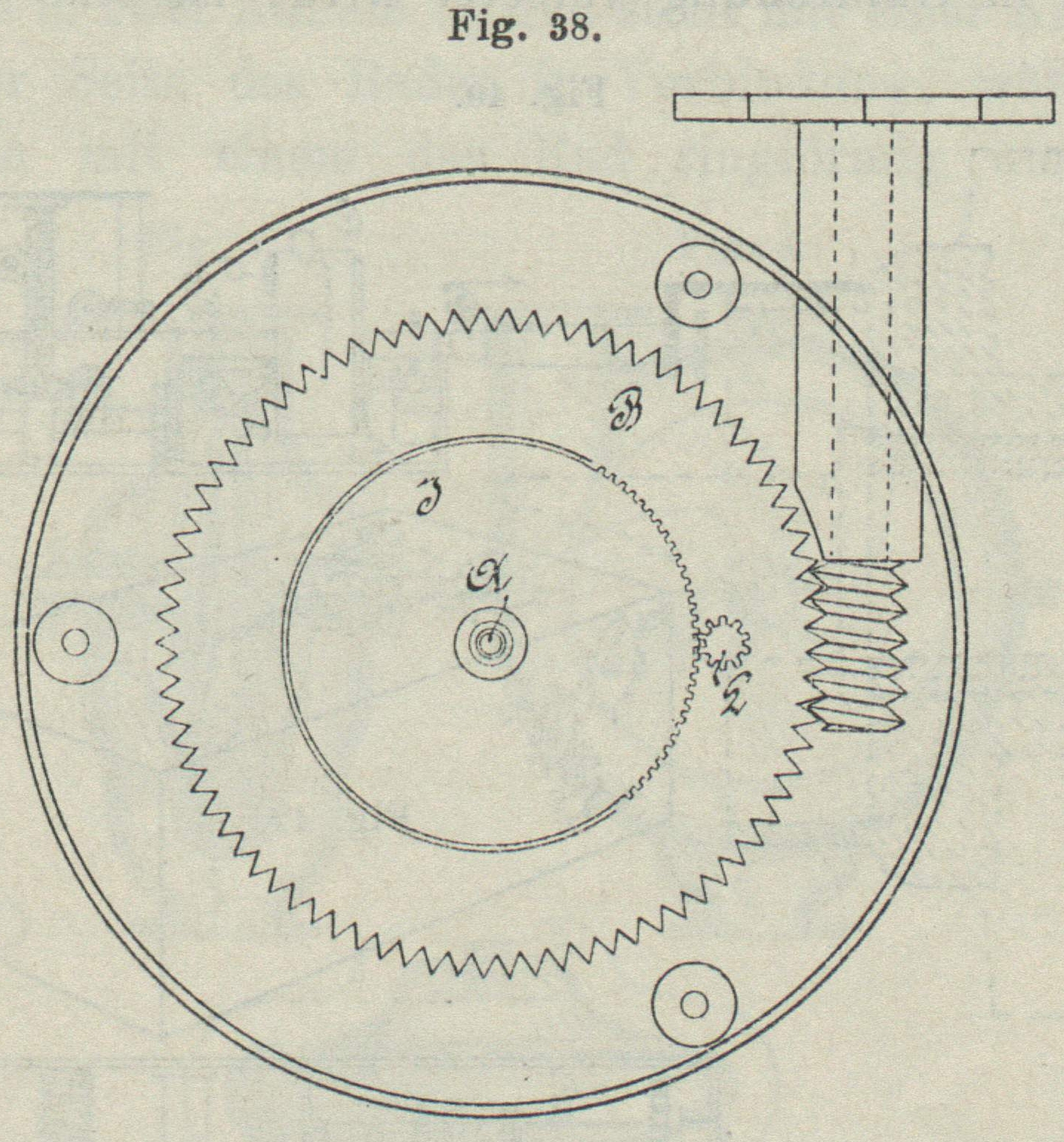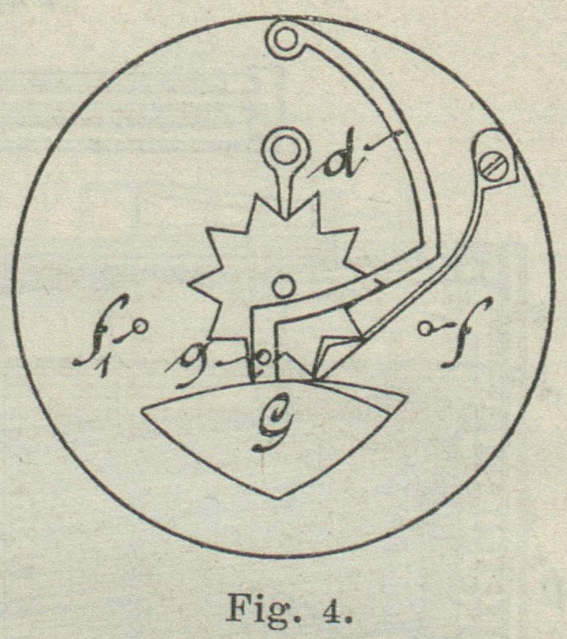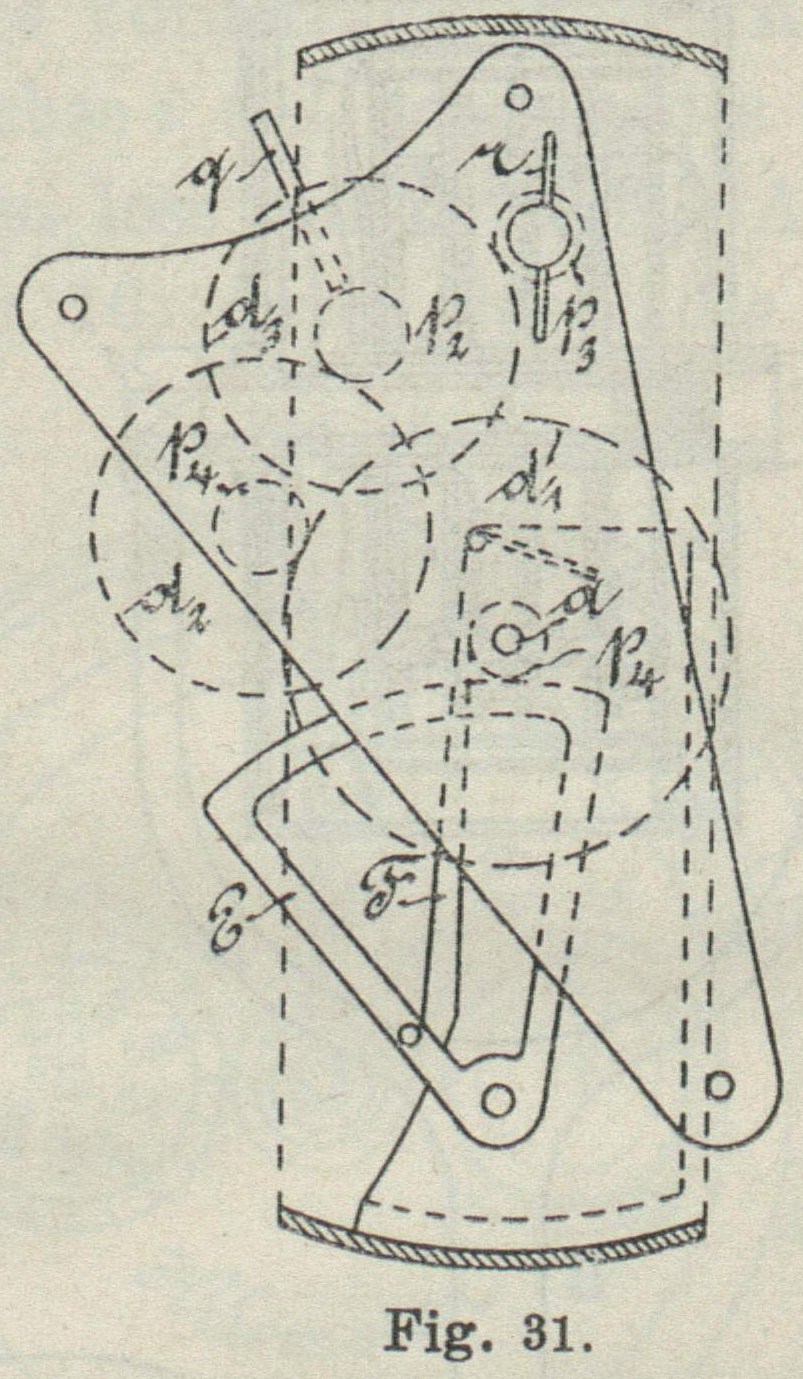 das Gehäuse und mit ihm der Trieb p4 anfängt, sich um die Achse a zu drehen. Der Trieb p4 greift in den Zahnbogen E ein, dessen Drehung die Feder F