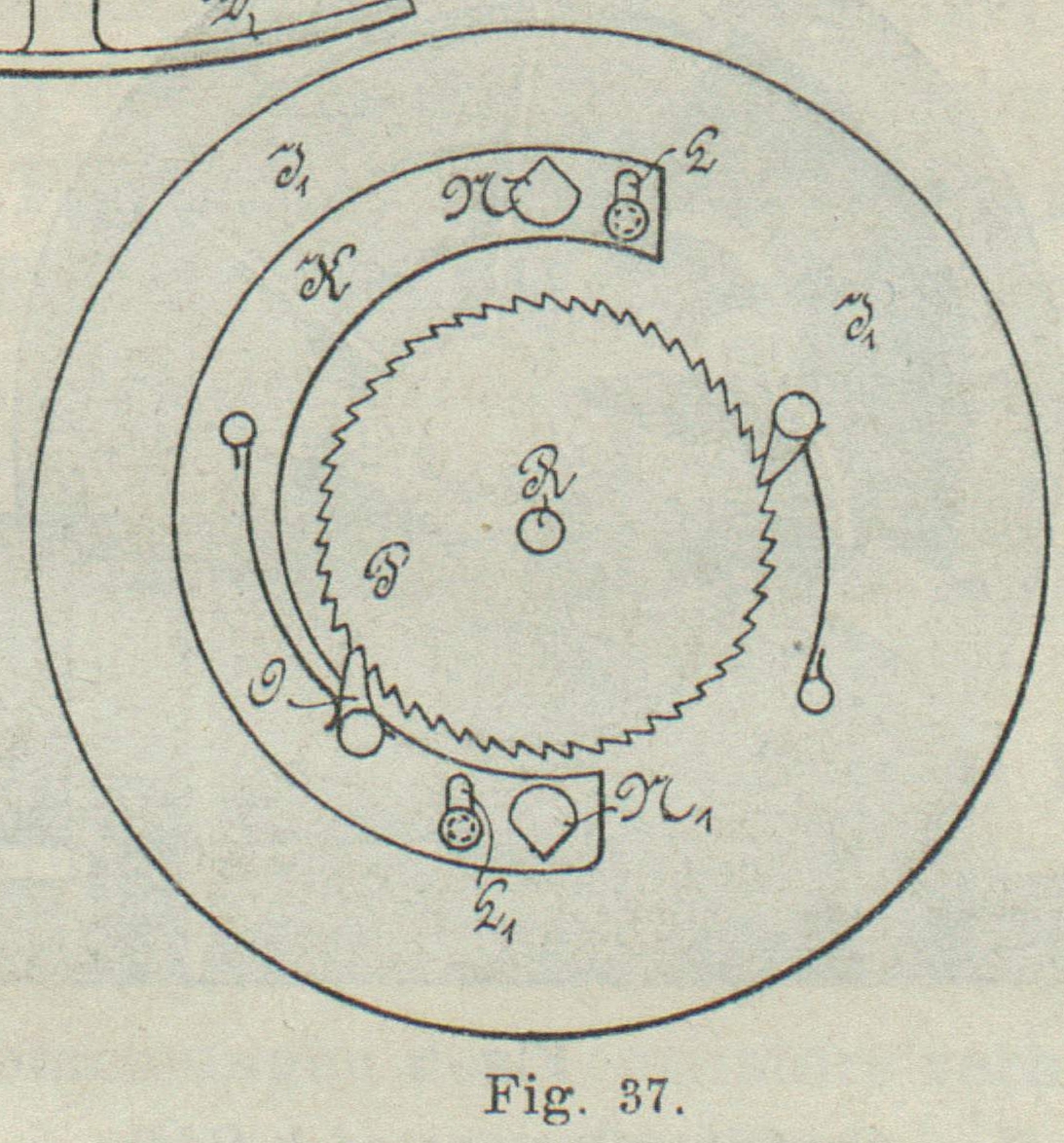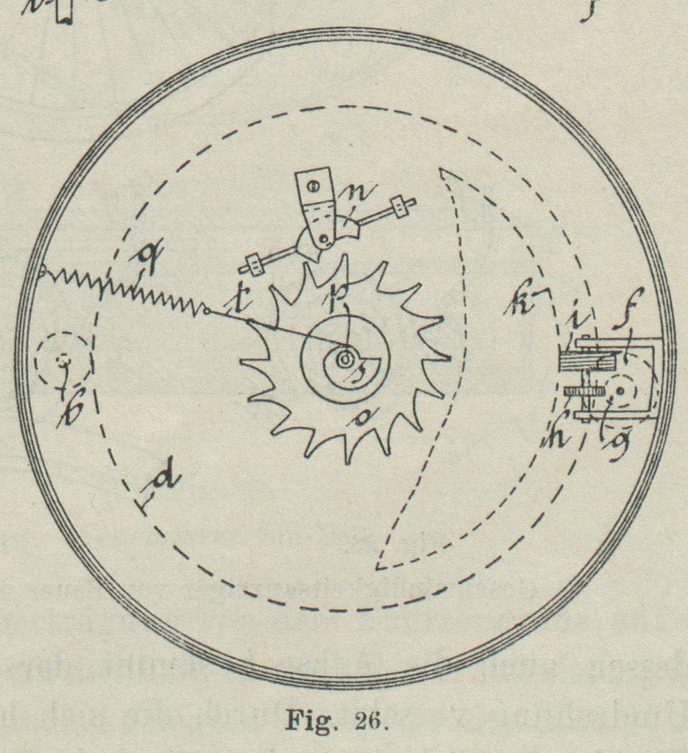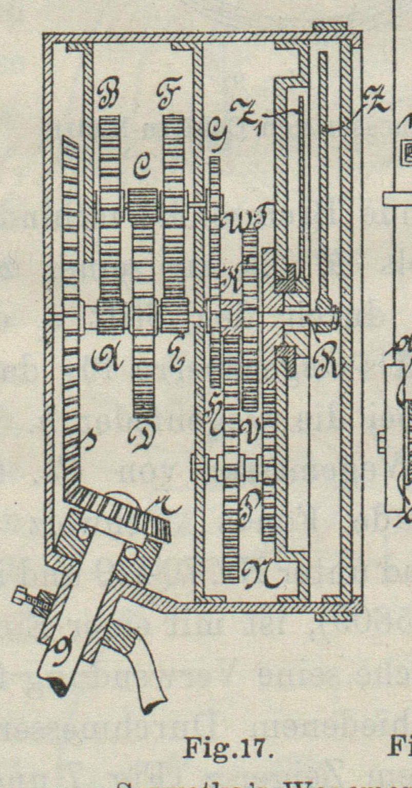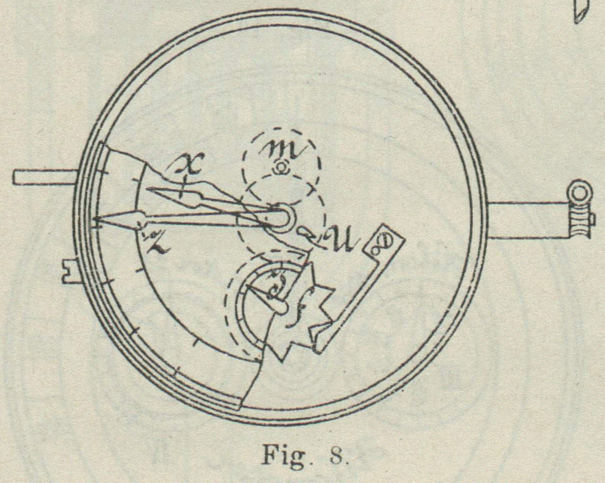 ein mit demselben fest verbundenes einzahniges Rad das Malteserrädchen u umtreibt. Mit der Welle des Rädchens u hängt ein auf der Rückseite angebrachtes Räderwerk