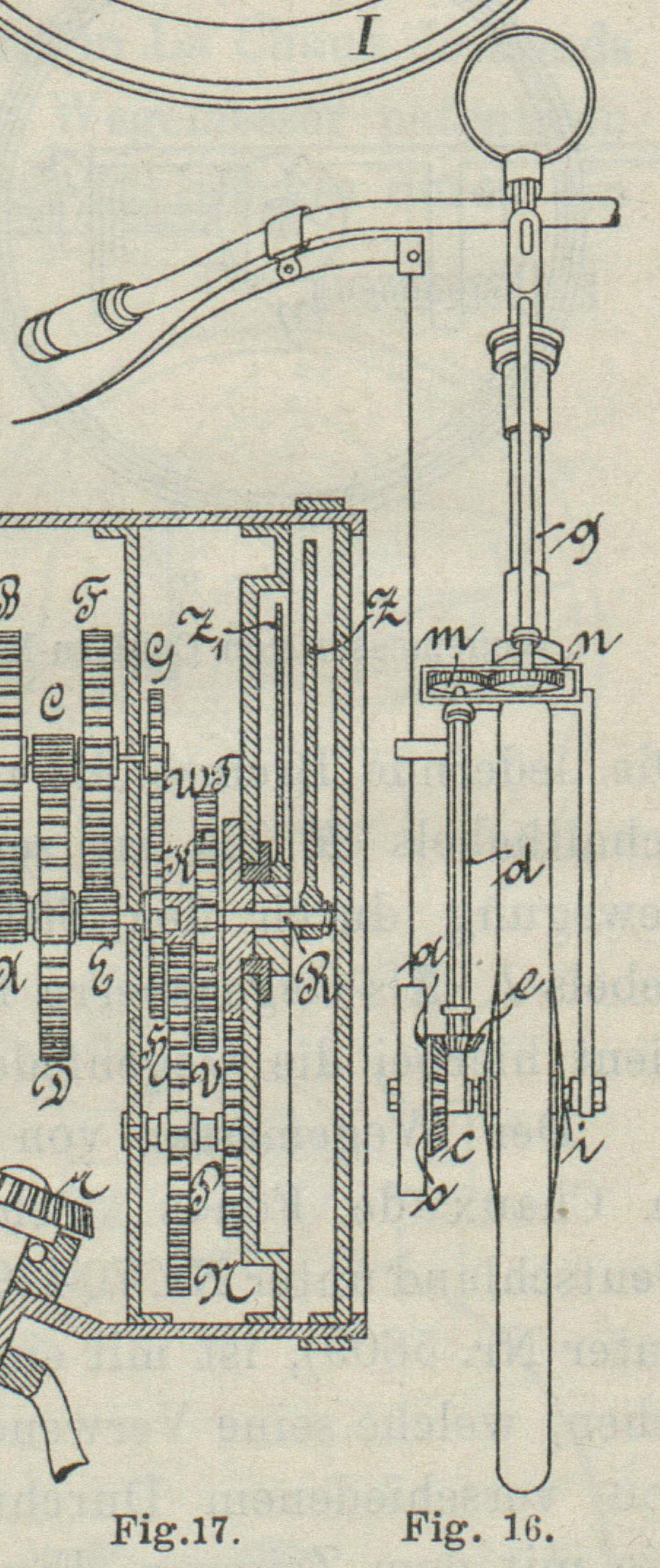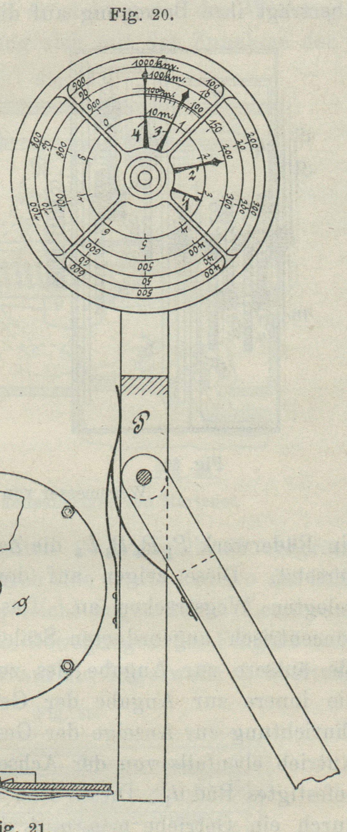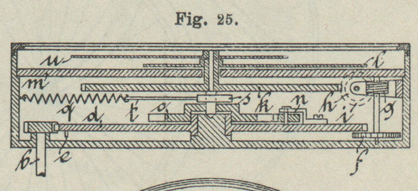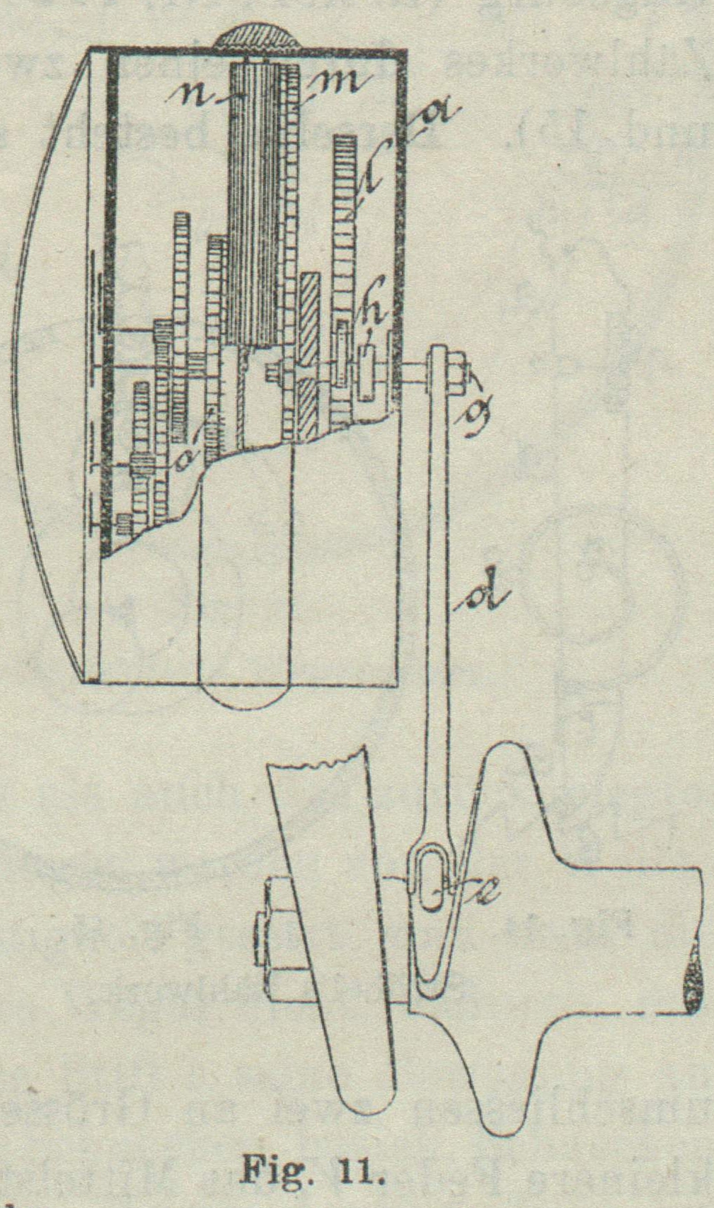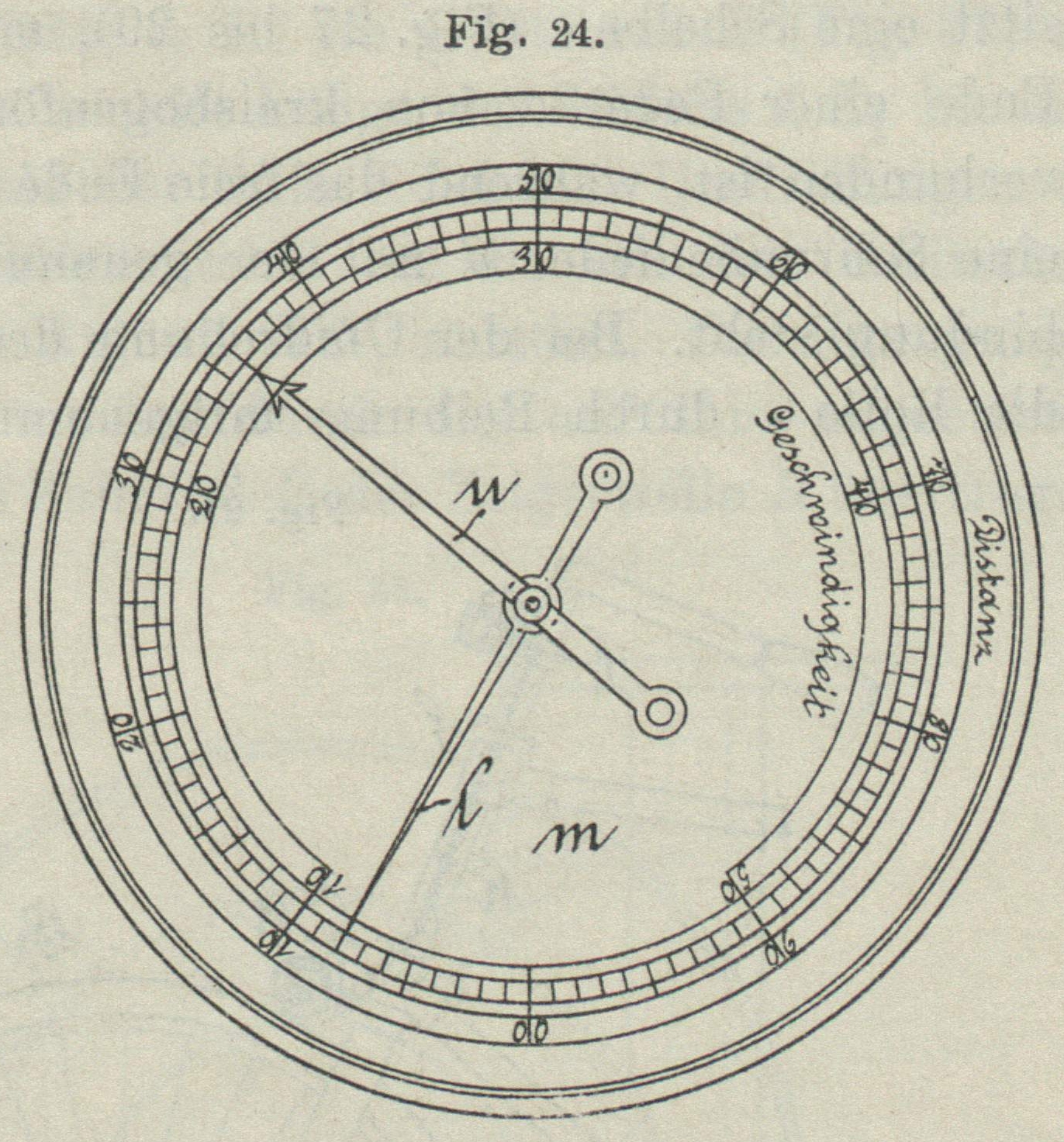Letztere sitzt auf der Zeigerwelle. Die Bewegungen der Flügel l werden also durch die Stange m auf die Zeigerwelle n3 übertragen, deren Zeiger n4 auf der Scala die Geschwindigkeit in