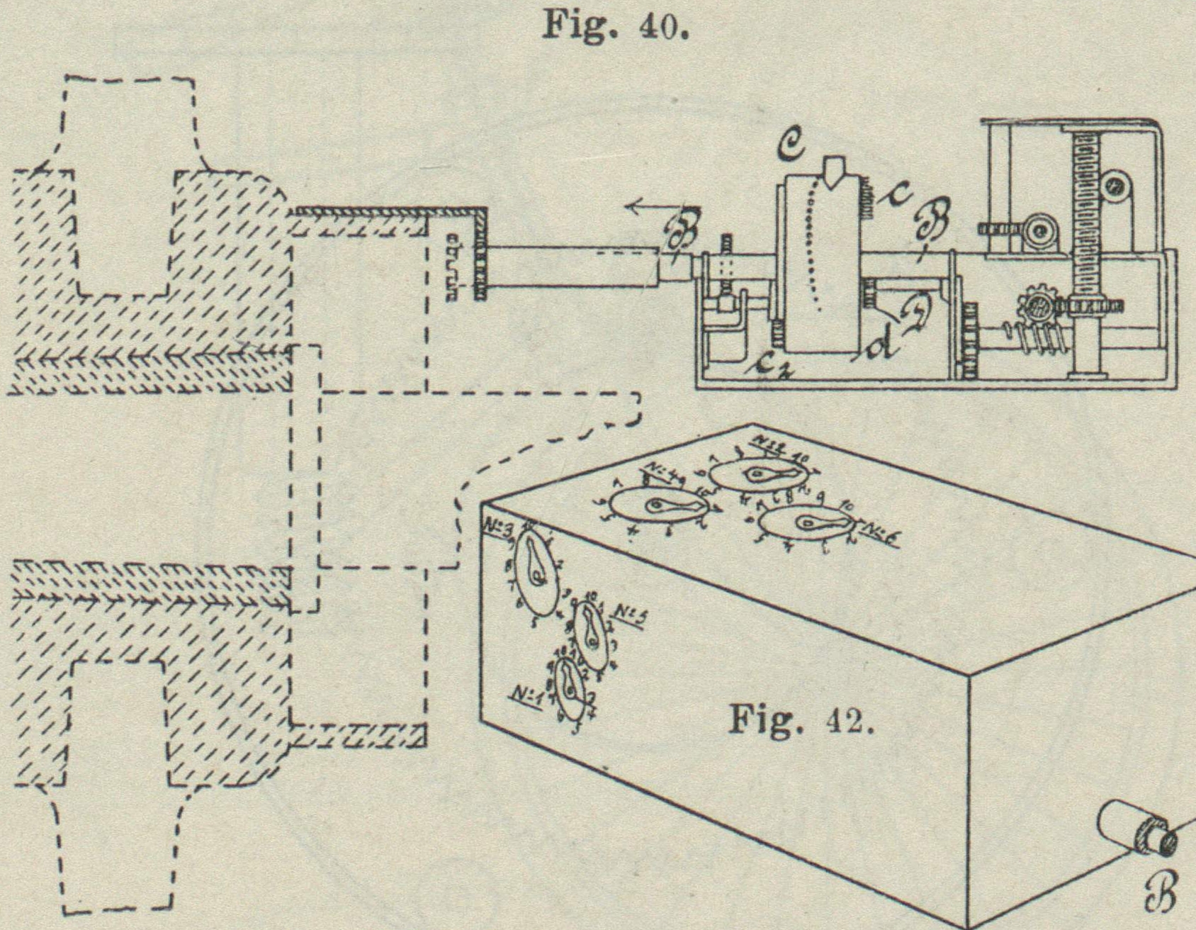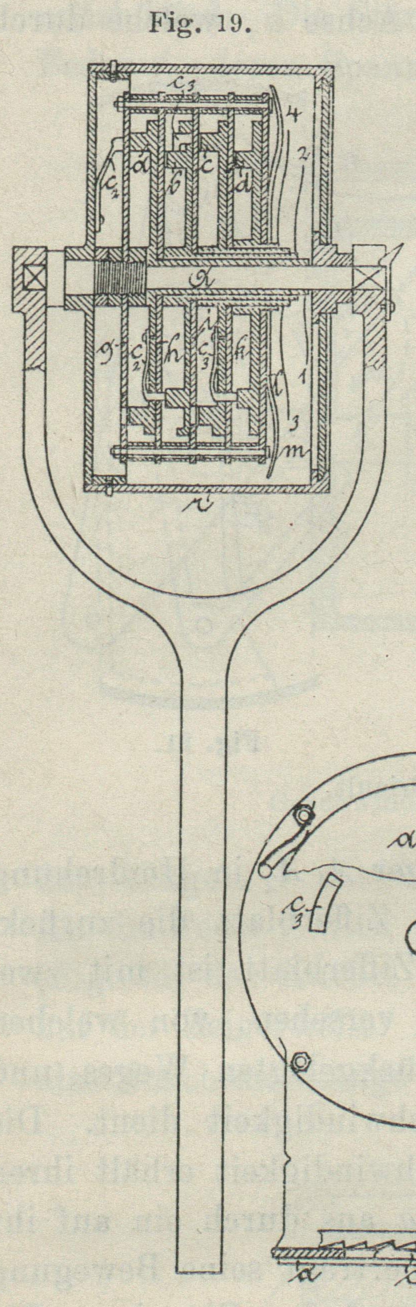 ausgerüstete Trommel C befestigt. Der eine Zahnsatz c befindet sich an der rechten Seite, der zweite Satz