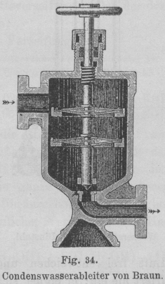 Der Condenswasserableiter von Justus Christian Braun in Nürnberg (Fig. 34) hat nur wenige bewegliche Theile, so