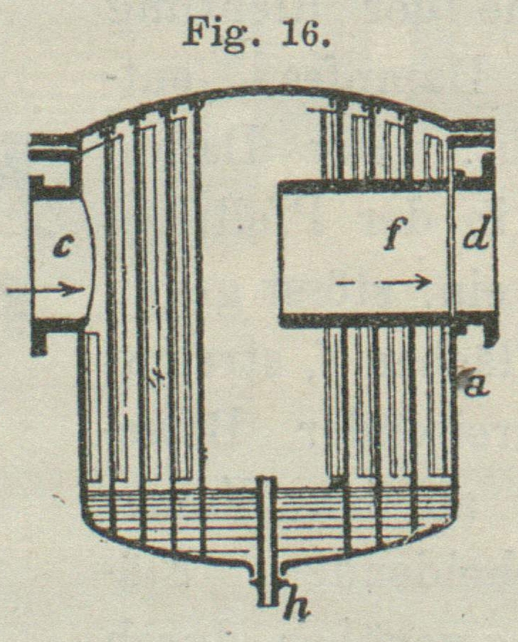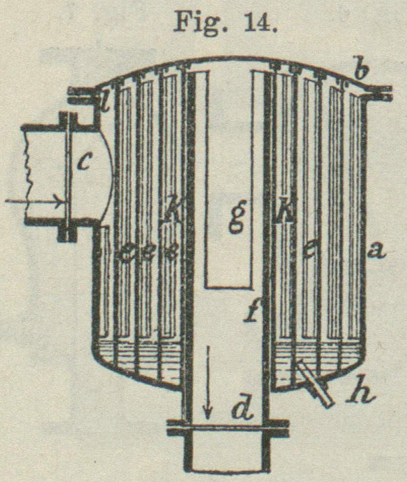 durch die Stutzen h zu dem Ausflussrohre B. Das Wasser gelangt, möglichst ohne dass der